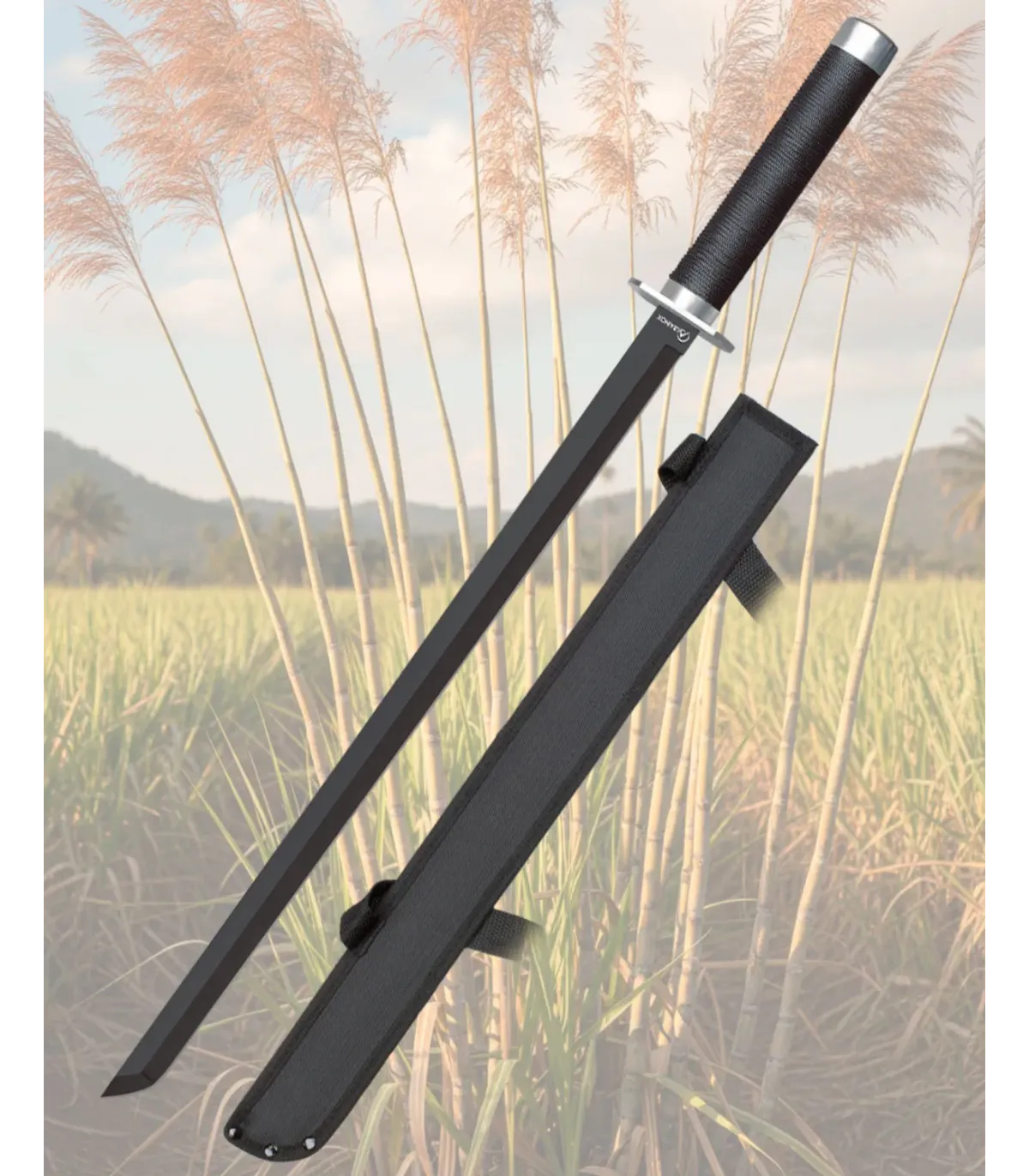 La garde rectangulaire en métal protège la main, apportant sécurité lors de mouvements exigeants, et le bout métallique à l'extrémité du manche équilibre la pièce, permettant de rendre les gestes longs plus contrôlés. La poignée enroulée noire, avec une texture stratégique, améliore la prise même avec l'humidité ou la sueur, réduisant la fatigue et augmentant la confiance à chaque manœuvre.