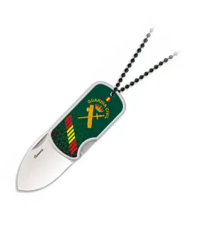 Navaja Guardia Civil Española con hoja en acero 3CR13MOV satinado de un solo filo y mango en aluminio + 3D con colgante de bolas. Tipo de bloque Frame Lock. Tamaño de la hoja: 4 cm.