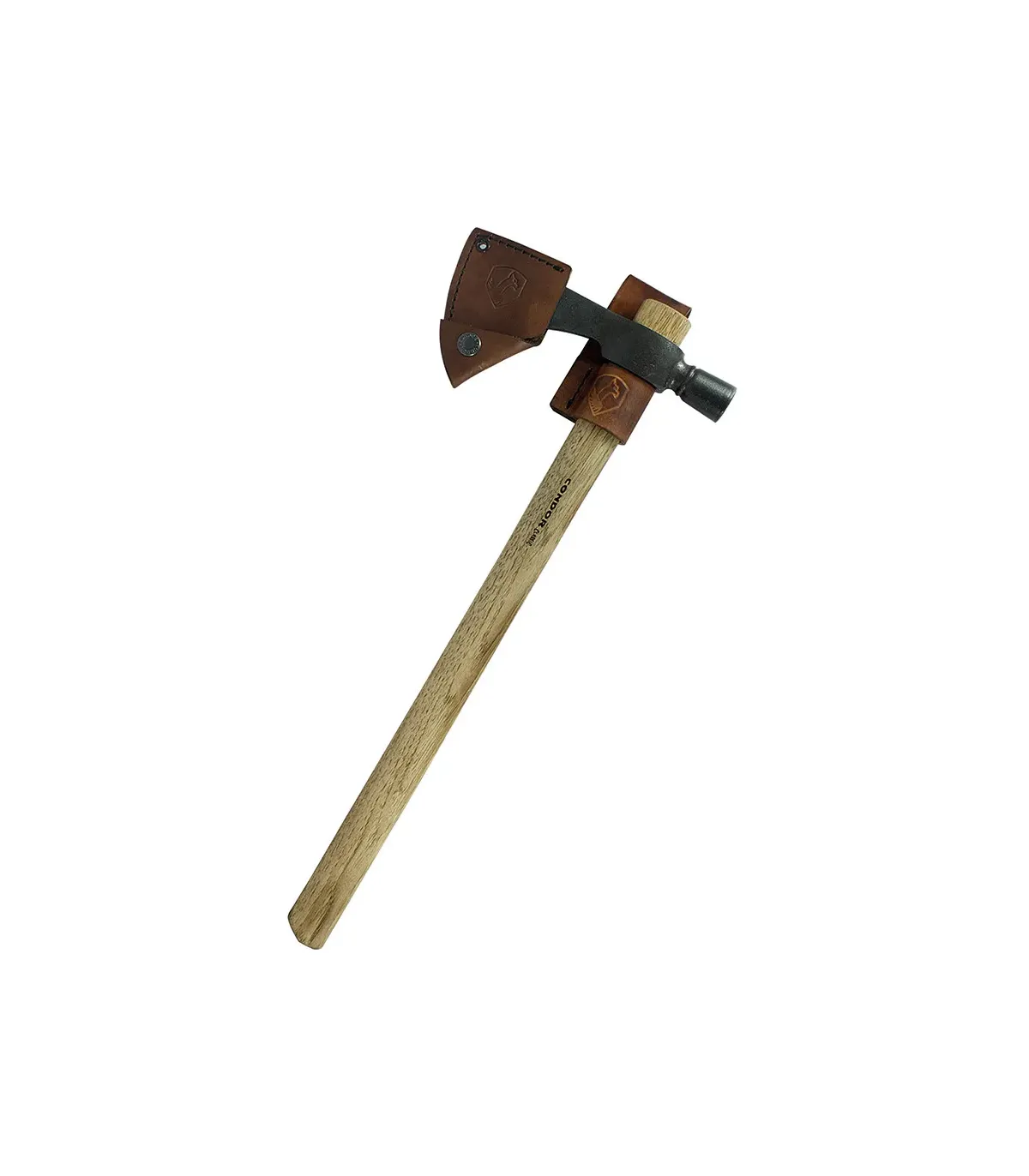 Ascia India Tomahawk di Condor, con fodero. È realizzata in acciaio forgiato ad alto contenuto di carbonio 1060 ed è trattata termicamente e rinvenuta a una durezza Rockwell di circa 50-55 con una finitura Condor Classic. Questa finitura è un processo perfezionato di martellatura a mano che conferisce un aspetto classico e migliorato a uno strumento già ben progettato. Gli artigiani di Condor utilizzano attrezzature manuali per ottenere questo motivo tradizionale e darle un aspetto come se fosse stata forgiata a mano più di 200 anni fa. La serie Classic è un successo tra gli appassionati dei campi storici, gli uomini di montagna e i rievocatori della guerra del periodo coloniale. Le maniglie in noce americano bruciato sono forti e conferiscono all'ascia da guerra un aspetto antico. Il fodero incluso è realizzato in pelle artigianale di alta qualità, resistente.