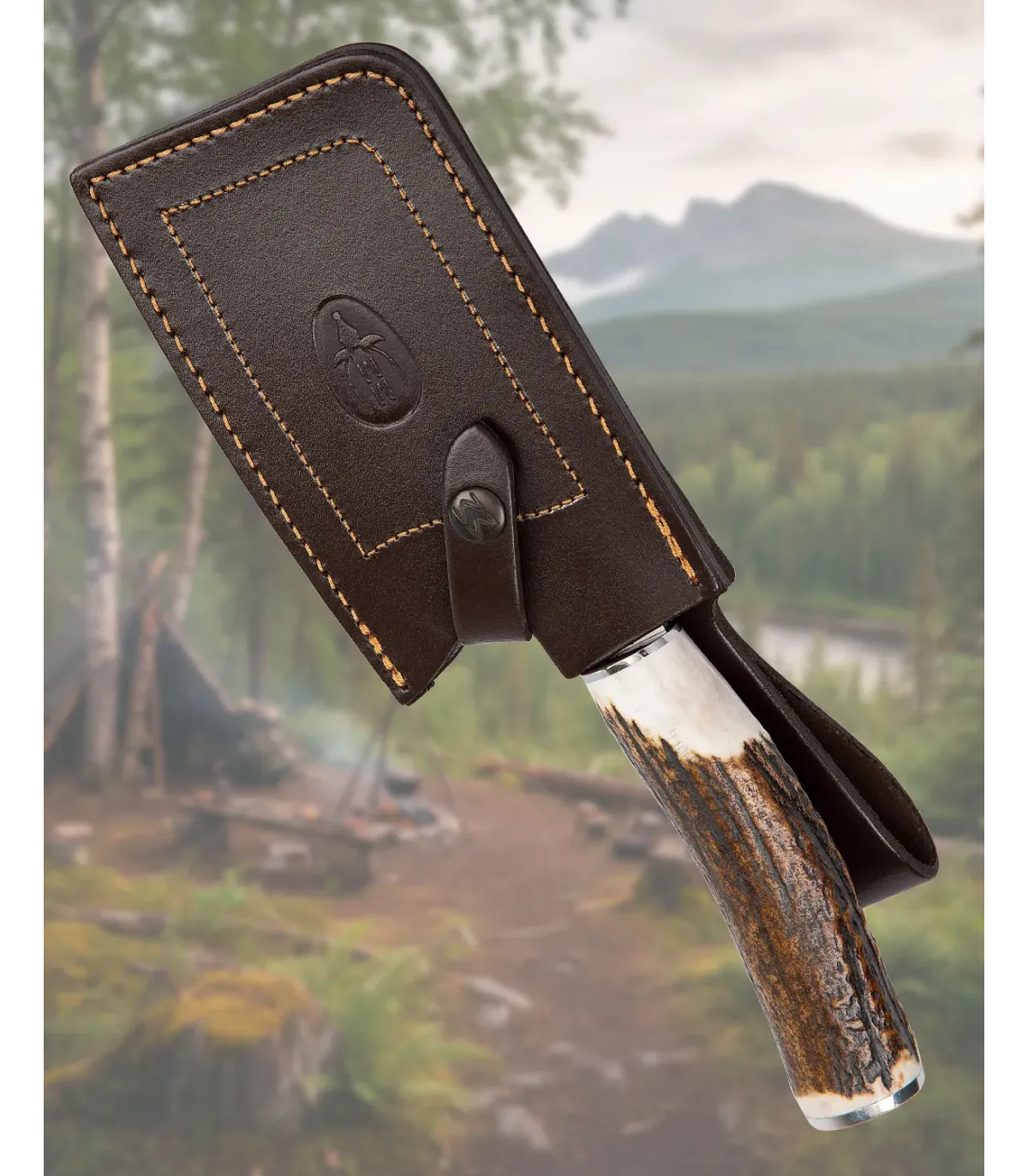 Il manico in asta di cervo conserva la texture e le venature naturali, offrendo un tocco caldo e una presa ferma. La sua forma leggermente curvata si adatta alla mano, facilitando il controllo e riducendo la fatica durante un uso prolungato. Il pezzo metallico tra lama e manico rinforza l'unione, dando una sensazione di solidità e sicurezza in ogni movimento.