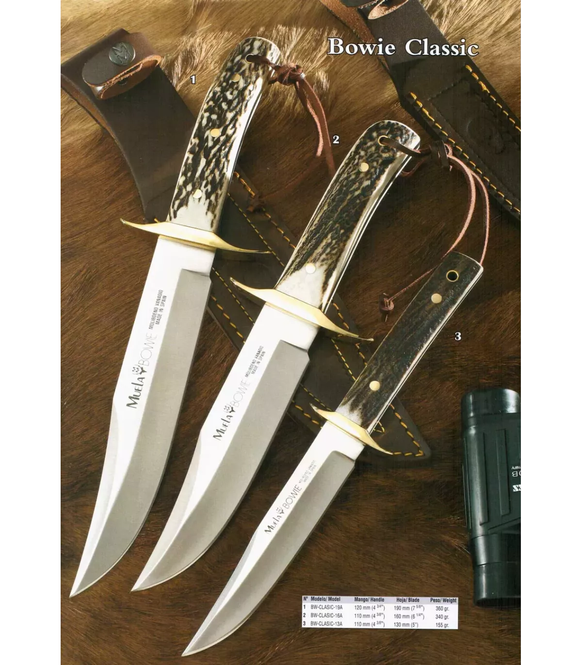 Se cerchi coltelli di alta qualità con un design classico, i coltelli della serie Bowie-Classic interi con manici in corno di cervo e ottone, prodotti dal marchio spagnolo Muela, sono la scelta perfetta per te. Questi coltelli sono stati progettati e realizzati con i migliori materiali, garantendo qualità e prestazioni nelle condizioni più dure sul campo.