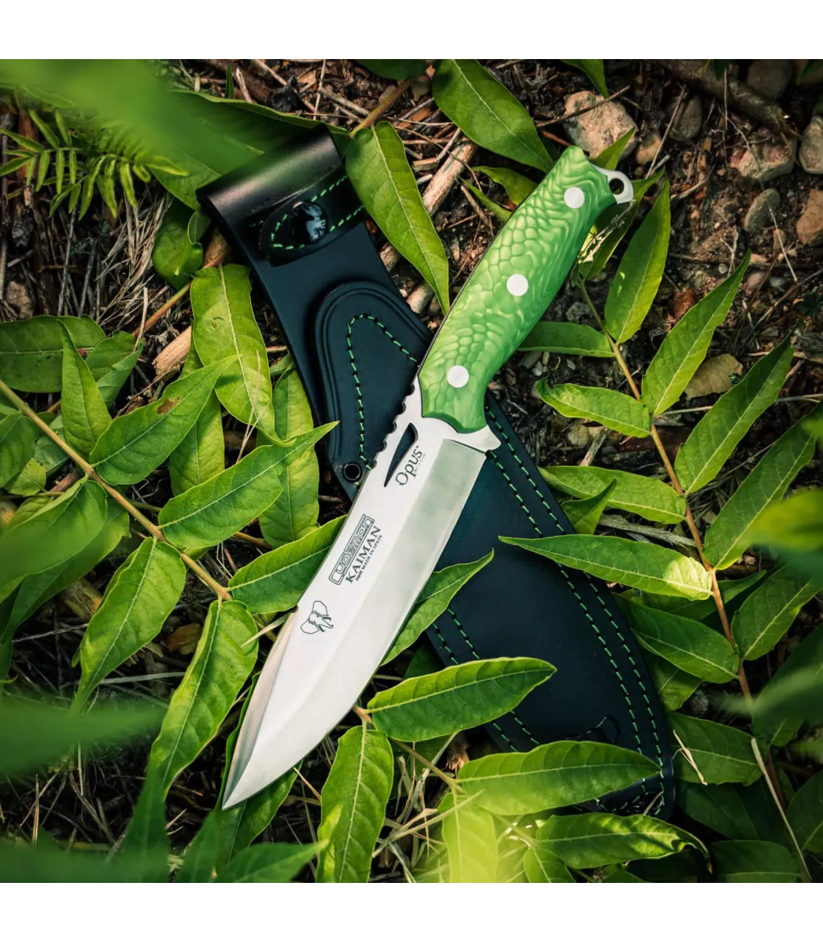 Coltello Kayman, verde juma e fondina in pelle