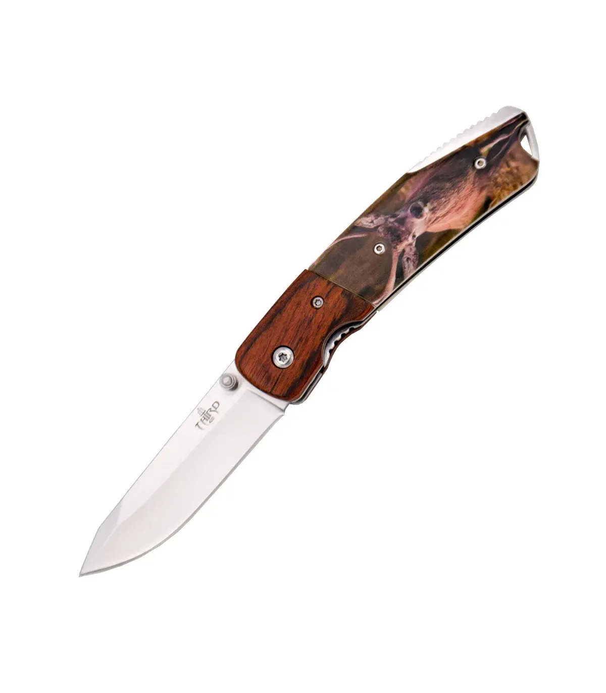 Risveglia il tuo spirito avventuroso e porta con te il coltello da caccia design cervo! Con il suo elegante manico in legno e ABS, questo coltello è il compagno perfetto per le tue spedizioni all'aperto. Il design 3D di un maestoso cervo ti trasporterà nella natura, creando una connessione unica con l'ambiente.