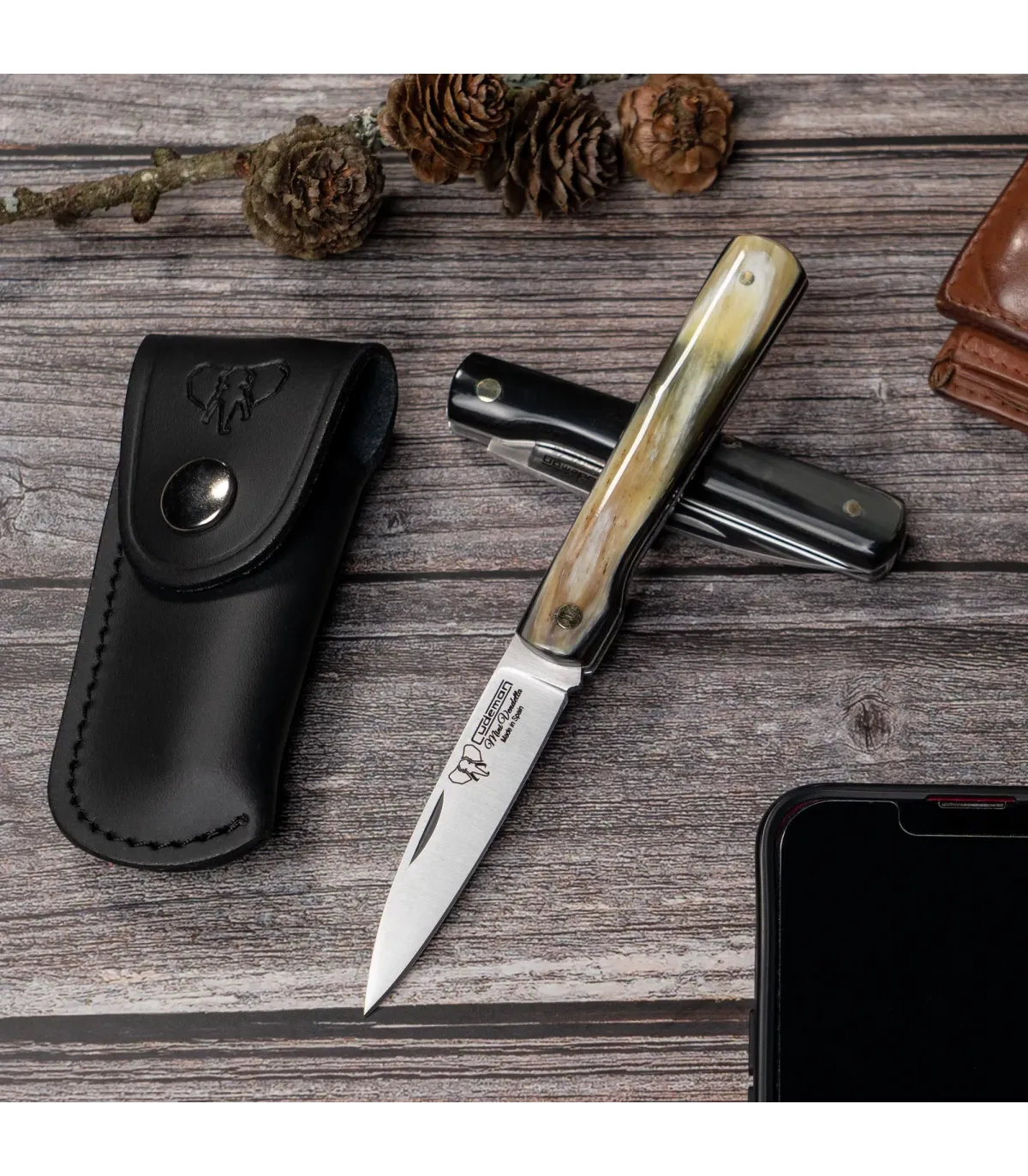 Il Coltello da caccia Mini Vendetta si distingue per i suoi dettagli impeccabili. L'ancoraggio del manico in filo di ottone garantisce una presa salda ed ergonomica, mentre il manico in corno di toro levigato conferisce un aspetto elegante e distintivo. Inoltre, è fornito con una fondina in pelle nera, che non solo protegge il coltello, ma aggiunge anche un tocco di raffinatezza al tuo equipaggiamento.