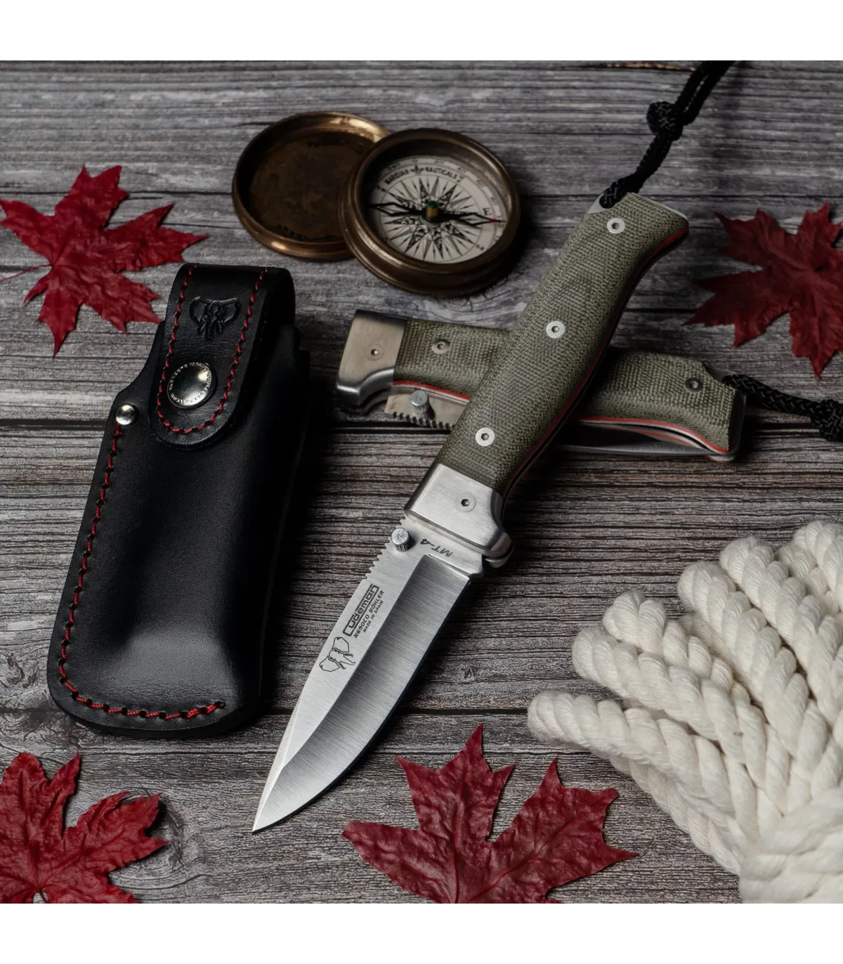 Il finissaggio spazzolato e satinato della lama garantisce prestazioni eccezionali in ogni situazione. Grazie alla punta Drop-Point, potrai godere di un controllo preciso e di versatilità nelle tue attività all'aperto. Con il sistema di chiusura a blocco posteriore, potrai affidarti al fatto che il coltello rimarrà sicuro e pronto all'uso quando ne avrai più bisogno. L'anello di fissaggio del manico con vite esagonale in acciaio inox e dado interno filettato in ottone assicura una presa salda e confortevole in ogni momento. Il design del manico in tela verde con separatore rosso non è solo estetico, ma anche funzionale. Inoltre, la fondina in pelle nera inclusa ti permetterà di trasportare il coltello in modo sicuro ed elegante.