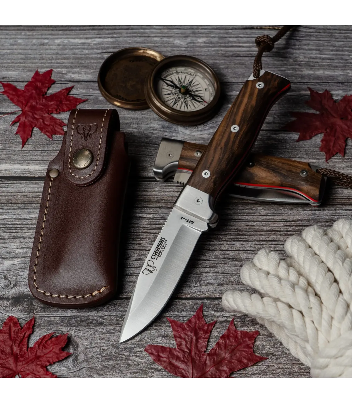 Il manico in noce satinato con separatore rosso non solo offre una presa ergonomica e comoda, ma aggiunge anche un tocco di eleganza al tuo equipaggiamento. Inoltre, il coltello MT-4 viene fornito con una fondina in pelle marrone, che lo protegge dagli agenti atmosferici e facilita il trasporto in modo sicuro.