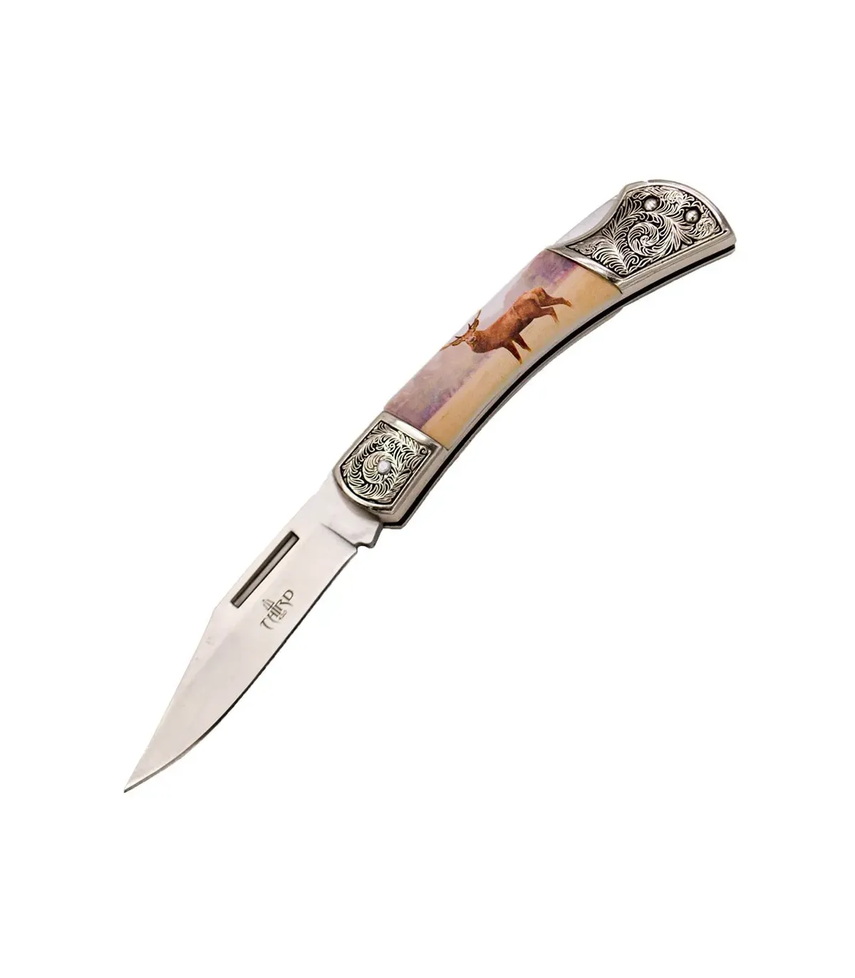- Design tematico affascinante: Il manico in ABS con stampa 3D di cervo è un tributo alla maestà della fauna e della caccia. I dettagli in rilievo e il design tematico rendono questo coltello visivamente accattivante e autentico. Le viti in acciaio decorate aggiungono un tocco di eleganza al pezzo.