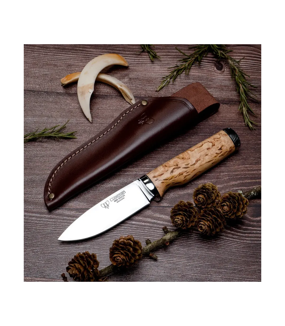 Il manico in betulla, lungo 115 mm, offre una presa comoda e sicura, anche in situazioni umide o scivolose. Il suo design ergonomico permette di maneggiare il coltello con precisione e facilità.
