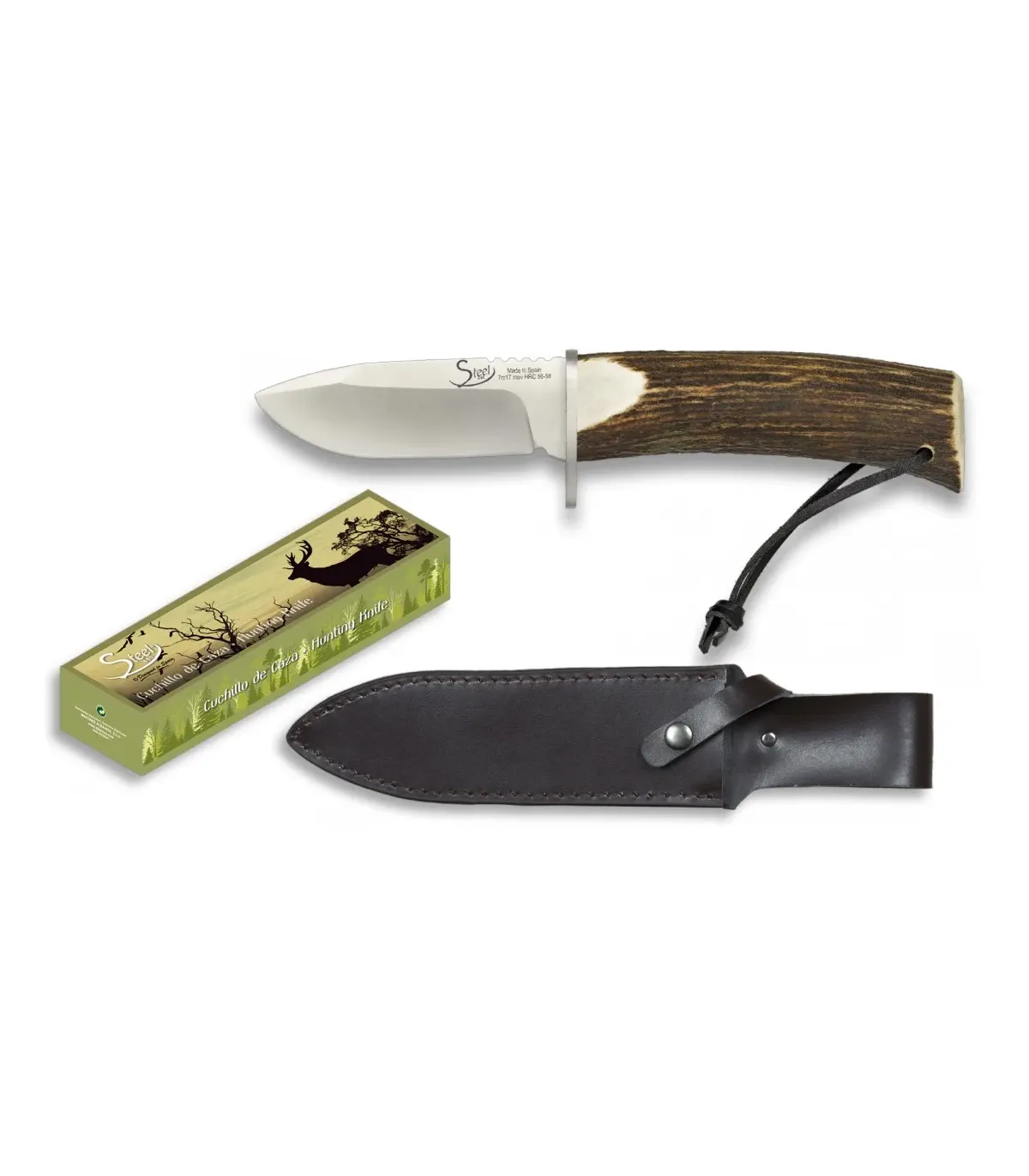 Scopri la qualità e la bellezza del coltello da caccia del marchio spagnolo Steel 440 con lama realizzata in acciaio inossidabile e impugnatura in corno di cervo. Questo coltello è uno strumento affidabile e versatile per le tue attività di caccia.
