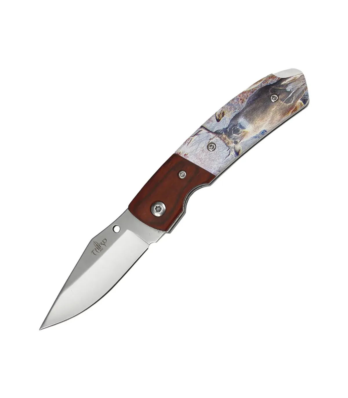 - Mango in Legno e ABS con Decorazione 3D di Cervo: Il manico in legno e ABS non solo garantisce durata, ma la decorazione 3D di cervo crea un effetto tridimensionale impressionante. Questo aggiunge un tocco di eleganza e originalità che lo distingue dagli altri coltelli.