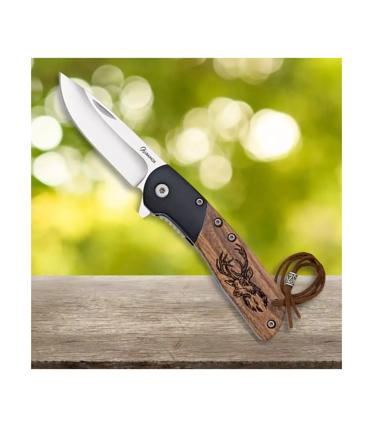 Il manico, realizzato in legno zebra nero, conferisce un tocco di distinzione con il suo veteado naturale e l'incisione di un cervo, simbolo di forza e libertà. Questo design non è solo estetico, ma anche ergonomico, offrendo una presa comoda e sicura durante l'uso. Inoltre, il sistema di blocco liner-lock assicura una maggiore stabilità durante l'impiego, mentre il clip integrato e il cordino in polipelle facilitano la portabilità.