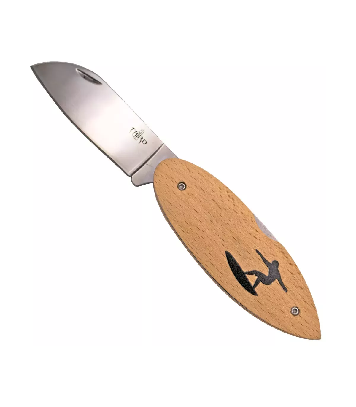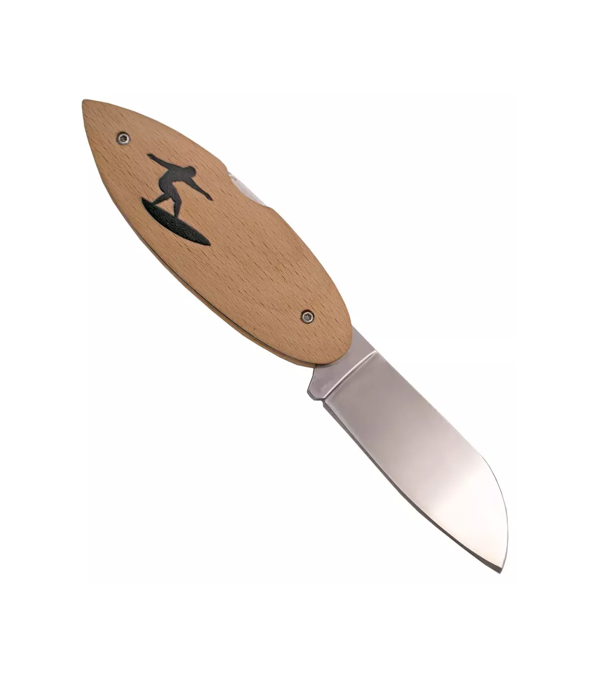 Il manico in legno di faggio offre una sensazione naturale e calda al tatto, conferendo robustezza e comfort durante l'uso. Ciò che rende speciale il modello SURFER M2 è la stampa di un surfista su entrambi i lati del manico, un dettaglio che cattura l'essenza della vita sulla spiaggia e l'amore per il surf. Questo design non solo aggiunge carattere al coltello, ma fornisce anche una presa salda e sicura.