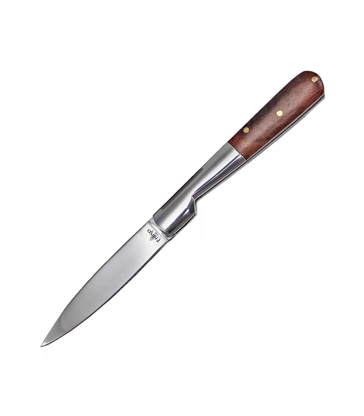 La chiusura a pistone garantisce un funzionamento fluido e sicuro, mentre il manico in legno di ulivo, con una lunghezza di 10,4 cm, assicura una presa comoda ed ergonomica. La rivetta rifinita a specchio aggiunge un tocco di sofisticatezza e lusso al coltello.