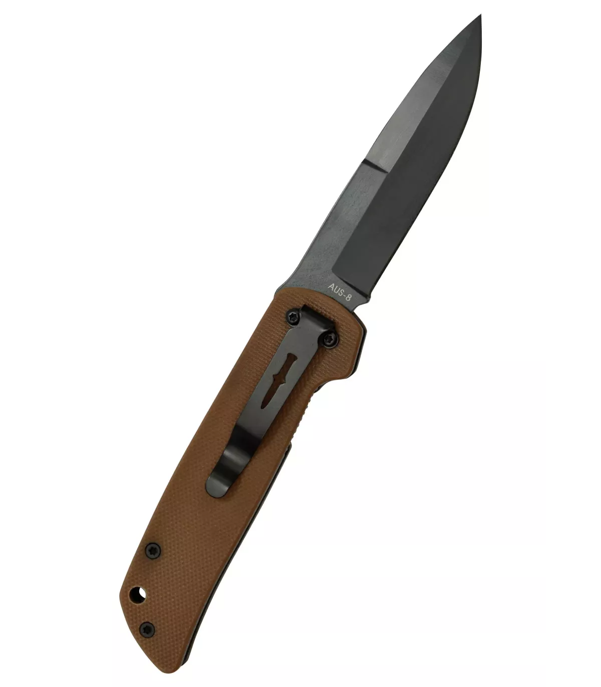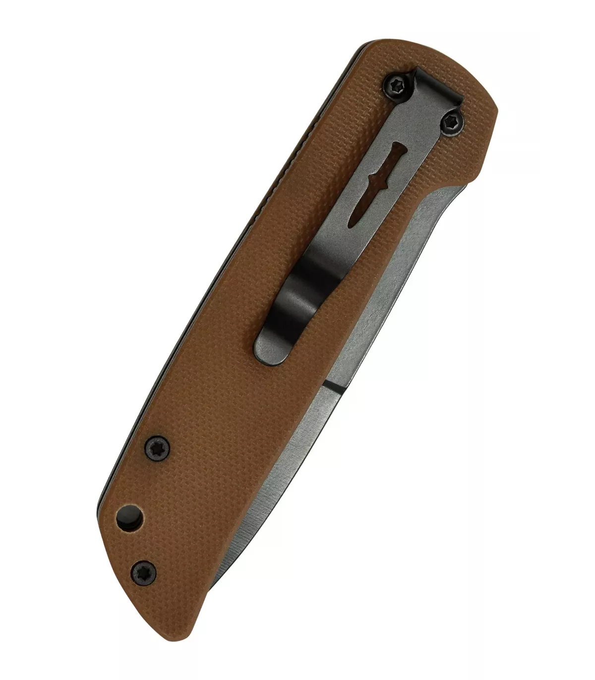 - Impugnatura ergonomica in G-10: L'impugnatura con scaglie di G-10 in tonalità marrone offre una presa sicura e confortevole in tutte le situazioni. Con la sua superficie ruvida e testurizzata, avrai un controllo ottimale sul tuo coltello in ogni momento. Inoltre, dispone di un foro per cordino e di una clip per cintura per una maggiore versatilità nel trasporto.