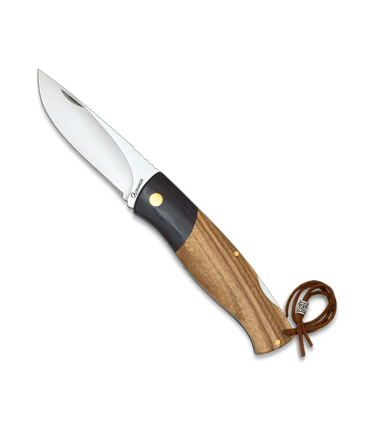 Il manico, ispirato ai motivi zebra, combina legno chiaro e dettagli in nero che non solo conferiscono un aspetto distintivo, ma anche una presa ergonomica e sicura, evitando scivolamenti. Include una piastra nera e una fodera in acciaio che rinforzano la sua struttura, rendendo questa lama un compagno resistente e facile da maneggiare. Inoltre, il blocco Back Lock fornisce sicurezza aggiuntiva durante l'uso, così puoi lavorare con tranquillità.
