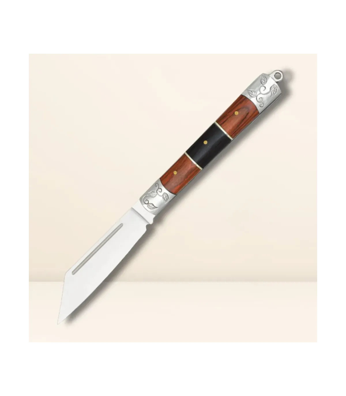 Il manico, una fusione di legno dai toni caldi e dettagli metallici, non è solo visivamente attraente, ma offre anche una presa comoda e sicura. Ogni sezione è stata accuratamente realizzata, assicurando che ogni transizione tra i materiali sia morbida e piacevole al tatto. Inoltre, i dettagli decorativi aggiungono un tocco di distinzione che farà risaltare questo coltello in qualsiasi collezione.