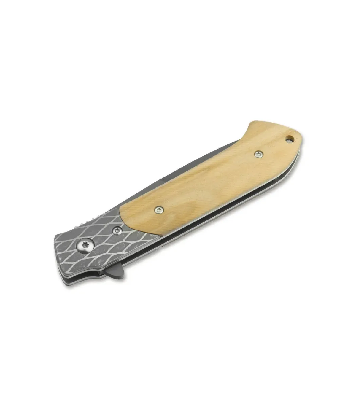 Il Böker Erebos è un capolavoro in termini di design, funzionalità ed eleganza. Questo coltello da tasca è una vera delizia per gli amanti dei coltelli. Il suo moderno flipper, lama con rivestimento grigio in acciaio inossidabile 440A e manici in legno di zebra chiaro, lo rendono un pezzo unico e sofisticato che si distingue in qualsiasi collezione.