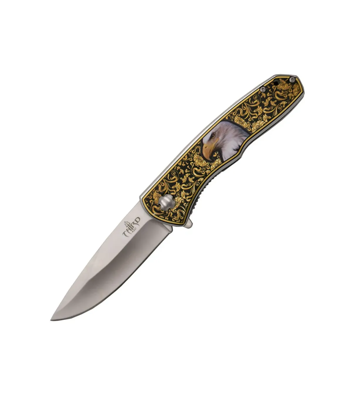 Il coltello assistito decorato Third K2104A con manico in alluminio con primeratura 3D di damaschinatura e aquila al centro, primeratura su entrambi i lati, lama in acciaio 420 di 9 cm è uno strumento versatile che può essere utilizzato per una varietà di compiti, tra cui tagliare corde, aprire scatole, pelare frutta e verdura, e molto altro. È uno strumento indispensabile per ogni avventuriero o amante della natura.
