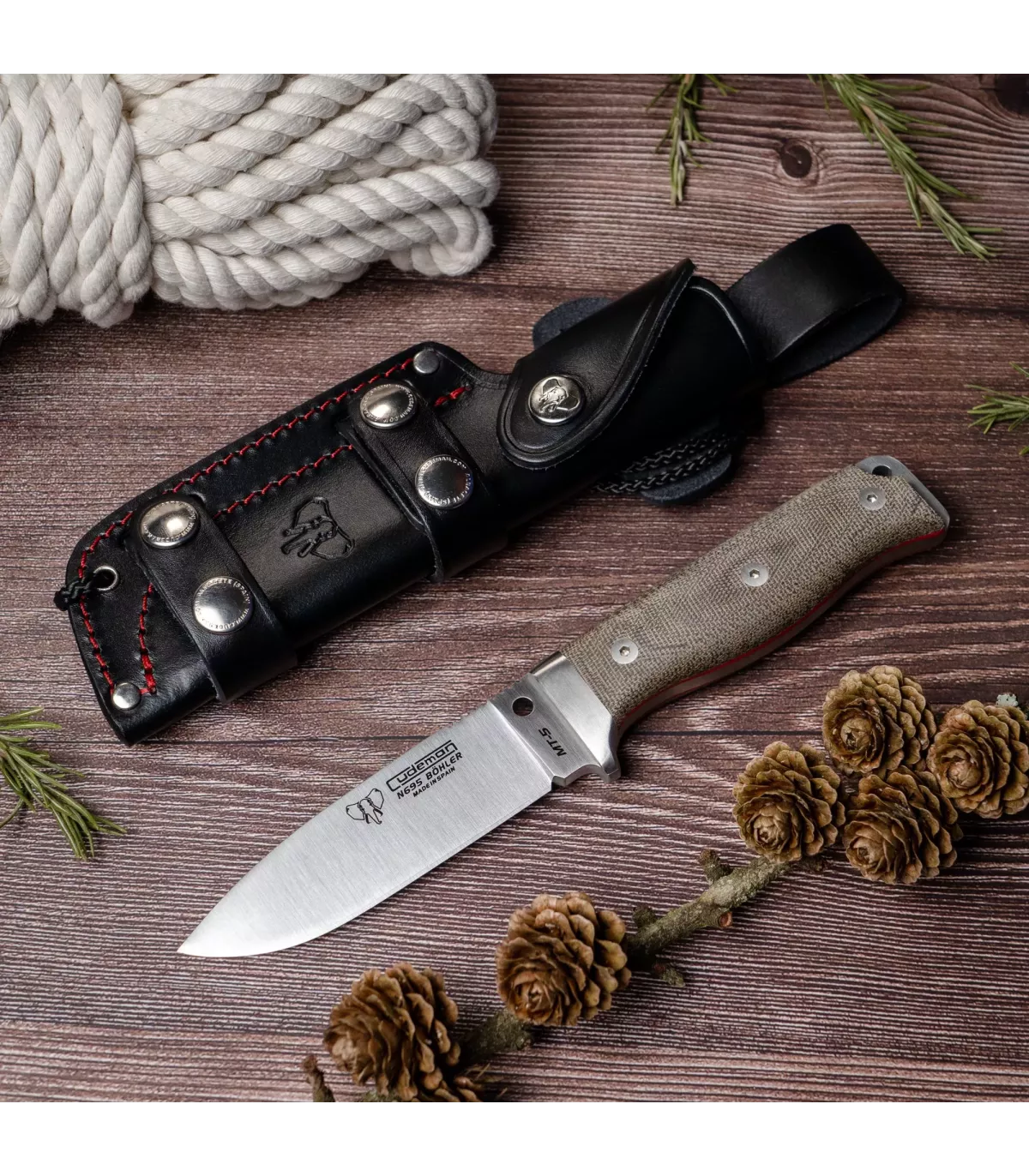Ma non è tutto: questo coltello è dotato di due passanti sulla lama e sul pomo percussore, che consentono di trasformarlo in una lancia utilizzando un cordino di sicurezza. La zip sul dorso offre una presa salda e affidabile in ogni situazione. Inoltre, la custodia multifunzione con passanti e rivetti permette di portarlo sia in verticale che in orizzontale, e include anche un adattatore per pietra e acciarino.