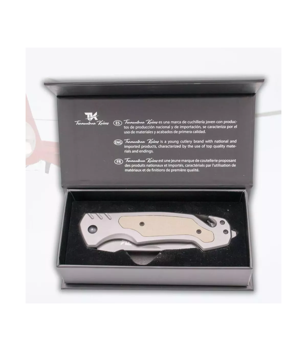 Il coltello di salvataggio Tramuntana Knives N84T è lo strumento ideale per chi cerca un equilibrio tra design e funzionalità. La sua lama in acciaio 420, lunga 9,6 cm, è rivestita in titanio grigio, garantendo una resistenza superiore alla corrosione e un’estetica attraente. Con uno spessore di 2,75 mm, offre un taglio efficiente e preciso, perfetto per ogni situazione di emergenza.