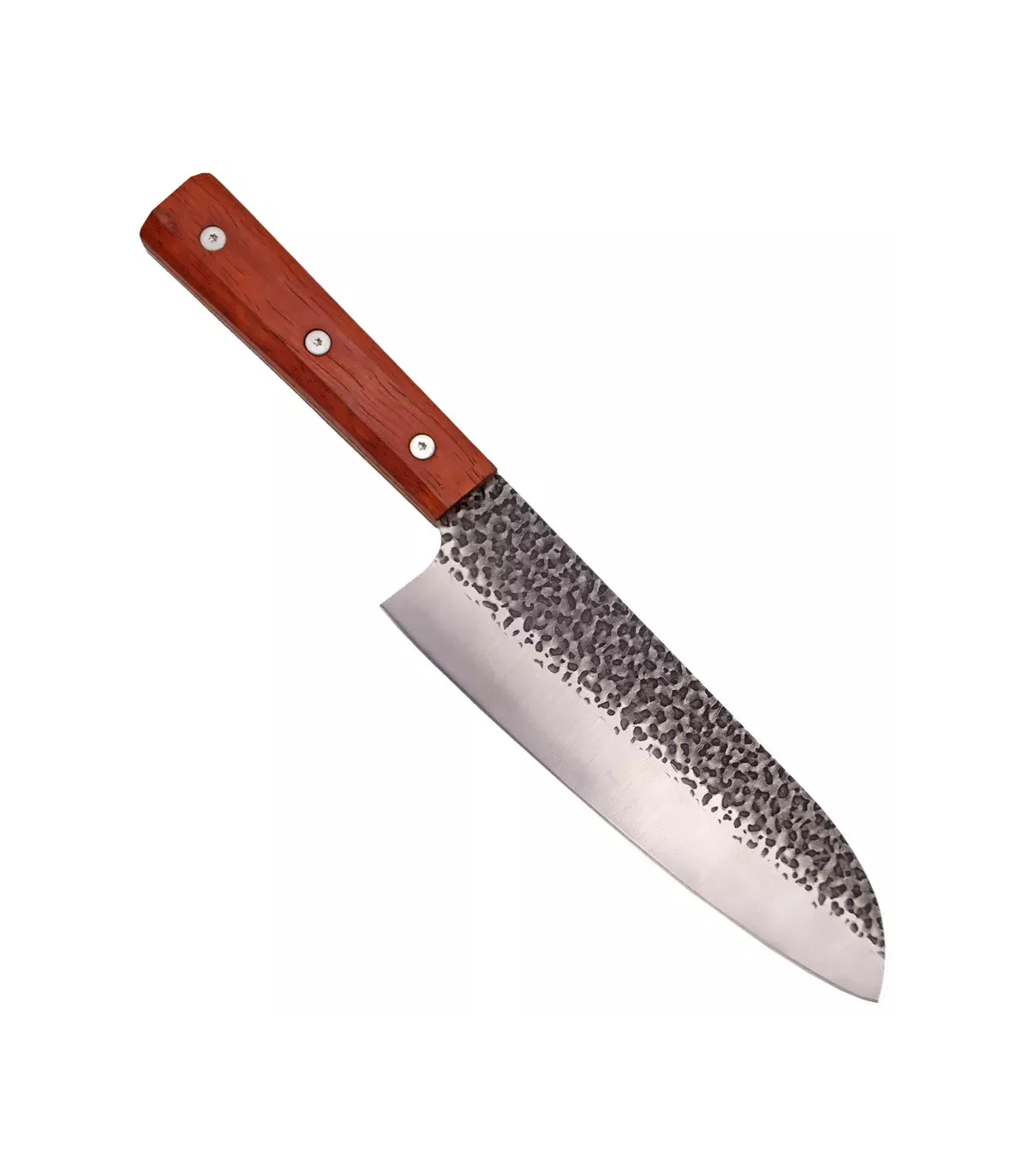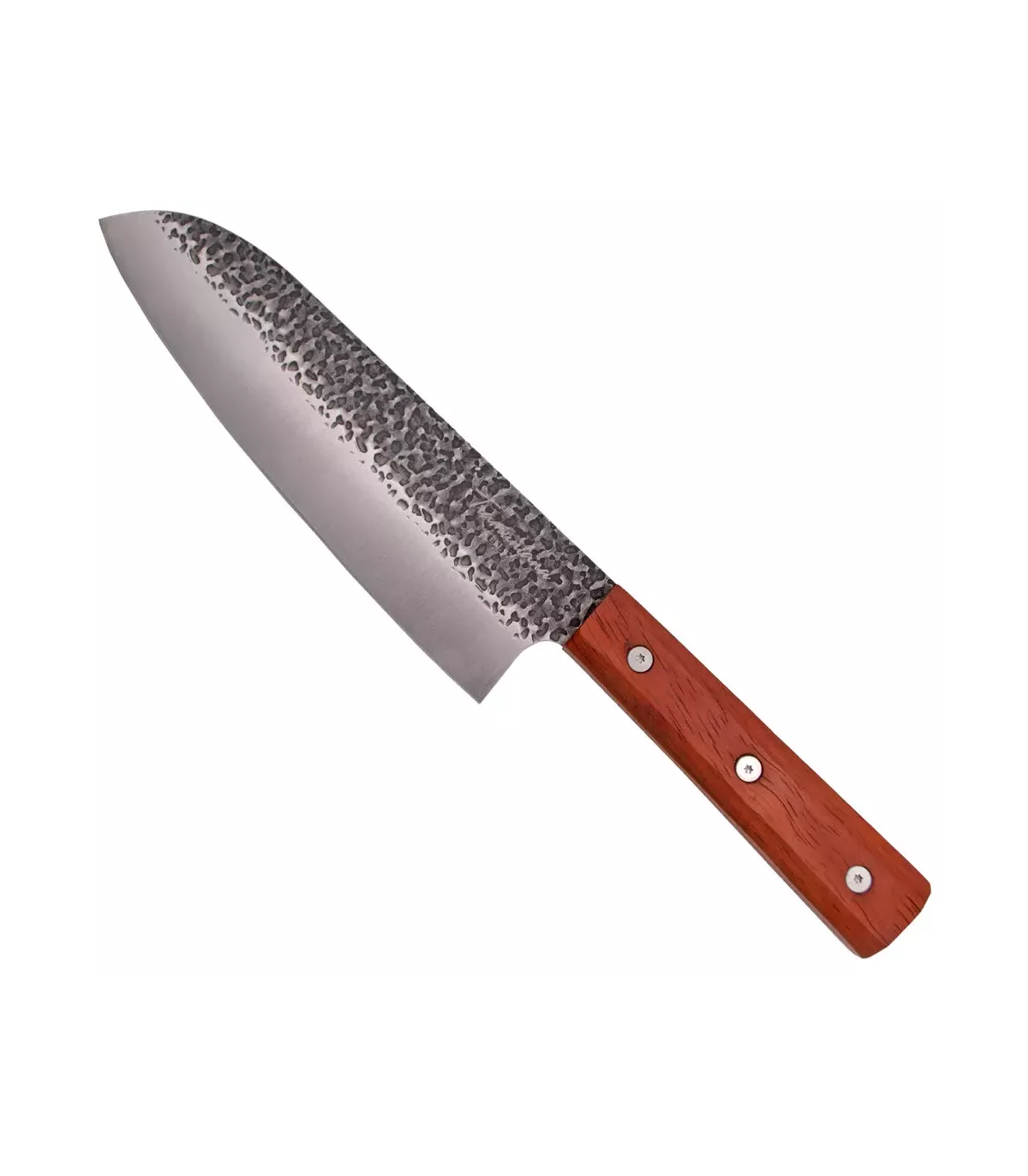 Il manico in legno di palissandro aggiunge un tocco di eleganza e comfort. Questo tipo di legno è noto per la sua resistenza e la sua bella venatura naturale, garantendo una presa salda e confortevole ad ogni utilizzo. Inoltre, il design ergonomico del manico facilita il controllo del coltello, permettendoti di tagliare con sicurezza e senza sforzo, anche durante lunghe sessioni di preparazione.