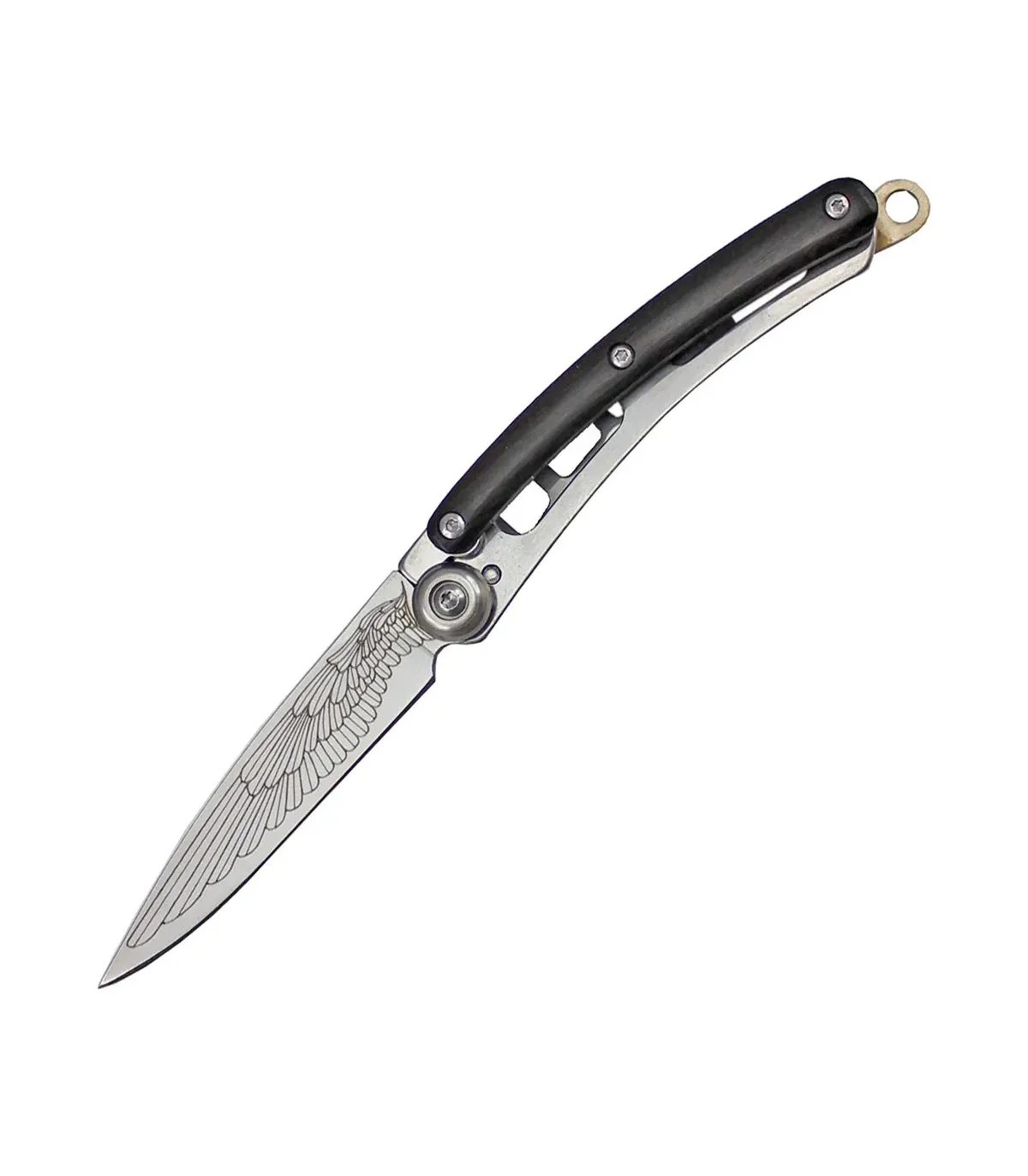 La chiusura a pistone garantisce una gestione fluida e sicura, mentre il manico in legno di ebano, lungo 9,3 cm, offre una presa comoda ed ergonomica. La lama in acciaio 420, lunga 7,4 cm e con uno spessore di 2,45 mm, fornisce un'eccellente capacità di taglio per una vasta gamma di compiti.