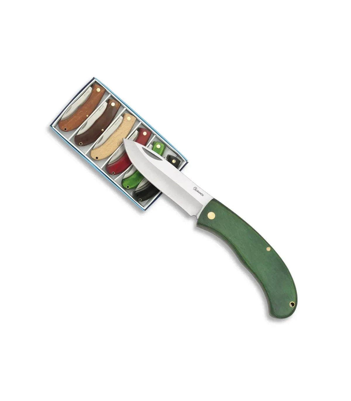 - Manico in Legno con Colori Vari: I manici in legno con colori assortiti non sono solo visivamente attraenti, ma offrono anche una presa comoda e sicura. Ogni coltello è unico e aggiunge un tocco di stile alla tua collezione di strumenti.