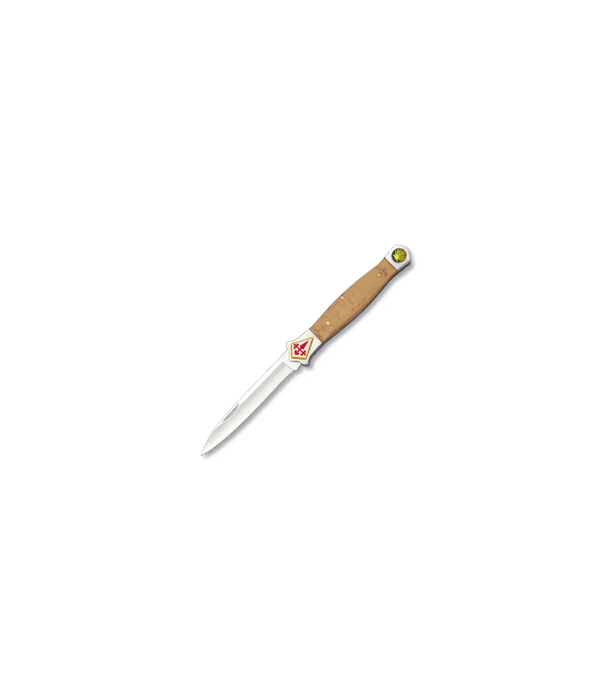 Coltello tipo stiletto con lo scudo della Croce di Santiago nel manico. La lama è in acciaio inossidabile e il manico è in legno.