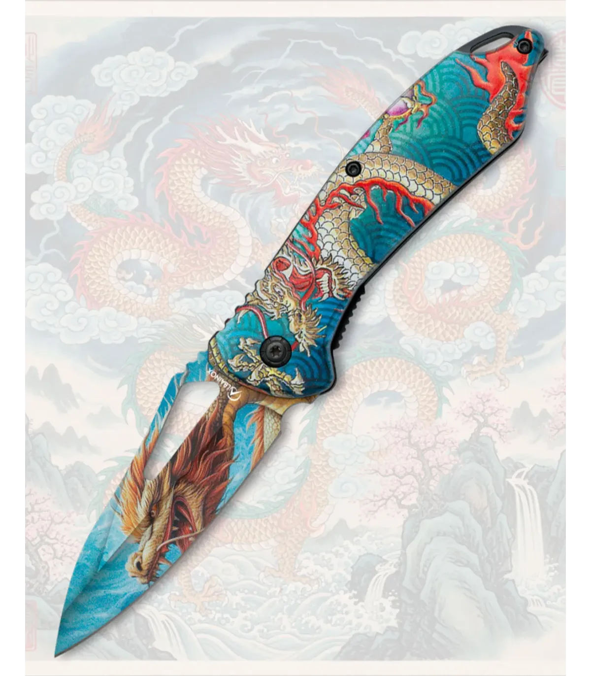 Hai voglia di portare con te qualcosa che combini forza visiva e funzionalità in ogni tasca? Questo design cattura immediatamente gli sguardi, con un drago che si estende dalla lama al manico, creando un pezzo che sembra uscito da un'illustrazione in movimento.