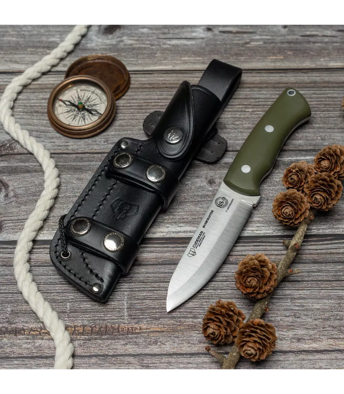 Het groene G10-handvat met zwarte separator combineert gebruiksgemak en een veilige grip, zelfs onder vochtige omstandigheden, dankzij het ergonomische ontwerp. Bovendien zorgt de platte aluminium klinknagel ervoor dat het handvat perfect aansluit op het lemmet, wat een solide en betrouwbare gevoel geeft bij elk gebruik. De zwarte leren multi-positie schede, met zilverkleurige drukknopen, biedt niet alleen bescherming, maar maakt het ook gemakkelijk om het mes veilig te dragen tijdens elke outdooractiviteit.