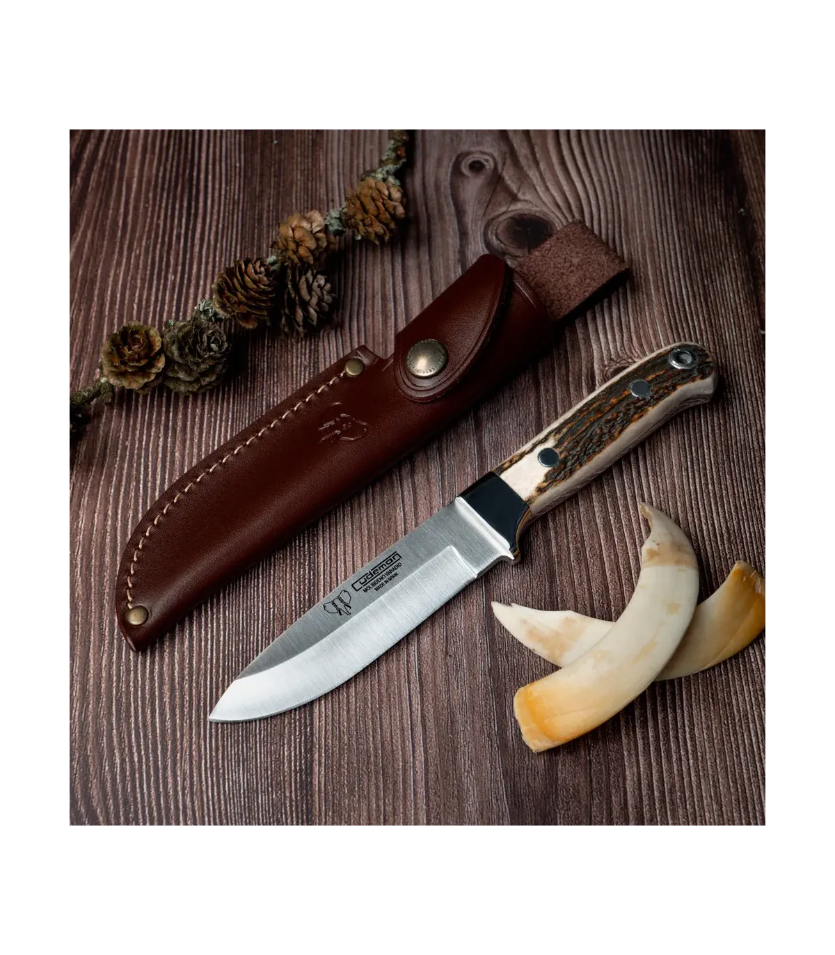 Het jachthandmes Cudeman wordt geleverd met een leren schede, ontworpen om je mes veilig te beschermen en te vervoeren. Je kunt het meenemen op je expedities, wetende dat het beschermd is tegen de elementen en klaar voor gebruik.