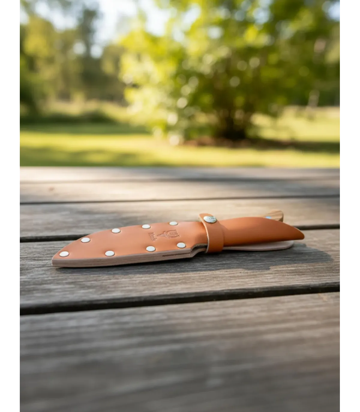 Inclusief een duurzame lederen hoes, perfect om het blad te beschermen en het transport te vergemakkelijken. Zo kun je het naar de werkplaats of buiten meenemen met de gemoedsrust dat het lemmet en de integriteit van het mes behouden blijven, altijd klaar voor het volgende project.