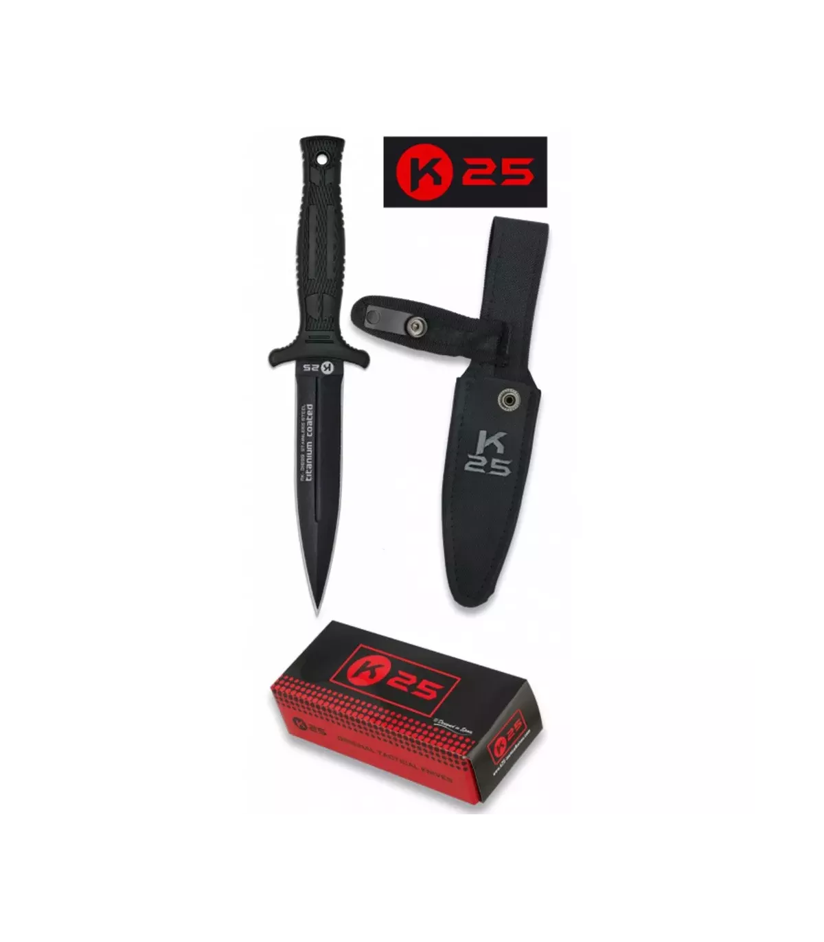 Ben je op zoek naar een hoogwaardig tactisch mes dat je in elke situatie kunt vertrouwen? Het tactische mes van K25 is precies wat je nodig hebt! Met een 12,5 cm lang roestvrijstalen lemmet met titanium coating en een totale lengte van 23 cm, is dit mes stevig en duurzaam.