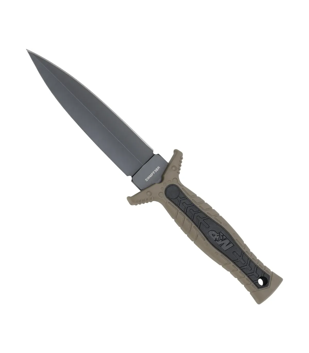 De ergonomische handgreep, met een zwarte centrale sectie en lichtbruine zijkanten, verenigt plessier in de hand en controle, dankzij reliefs die zijn ontworpen om de hand te omarmen en de brede ricasso die de vingers beschermt. De combinatie van sterk polymeer en rubberen inzetstukken biedt een veilige grip, zelfs onder vochtige omstandigheden, en het lanyard gat vergroot de opschortmogelijkheden.