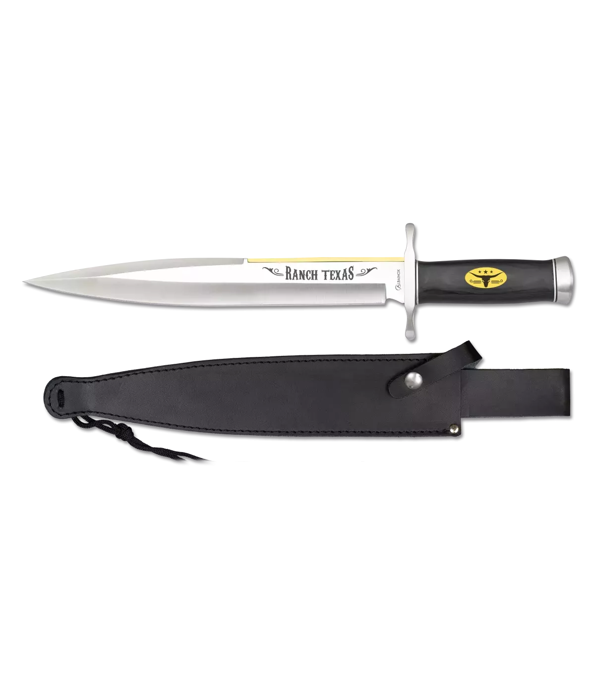 Het zwarte stamina-handvat, met 13,50 cm, biedt niet alleen een stevige grip, maar voegt ook een vleugje verfijning toe. Met een totale lengte van 44,00 cm onderscheidt het RANCH TEXAS-mes zich door zijn veelzijdigheid en imposante uitstraling.