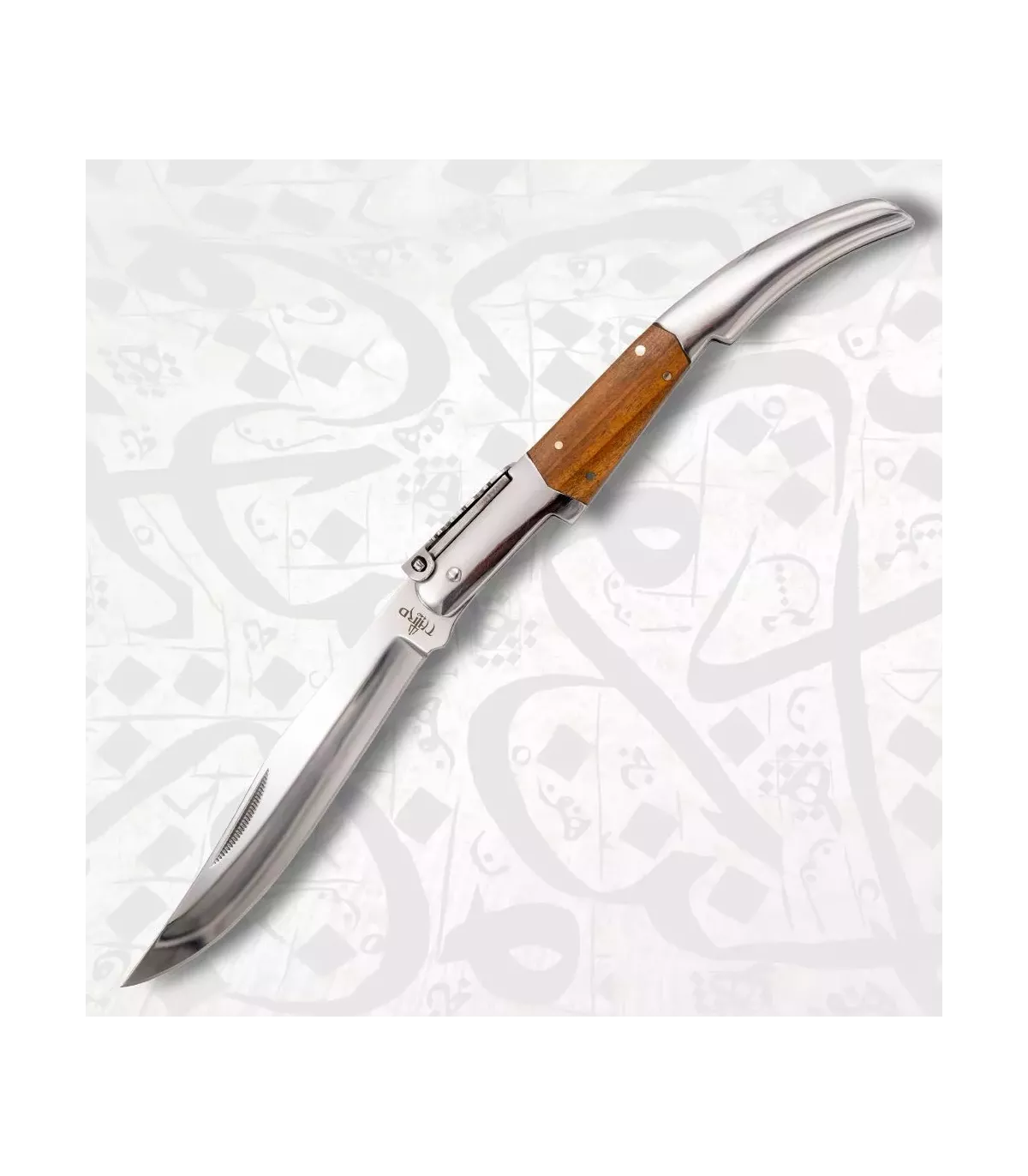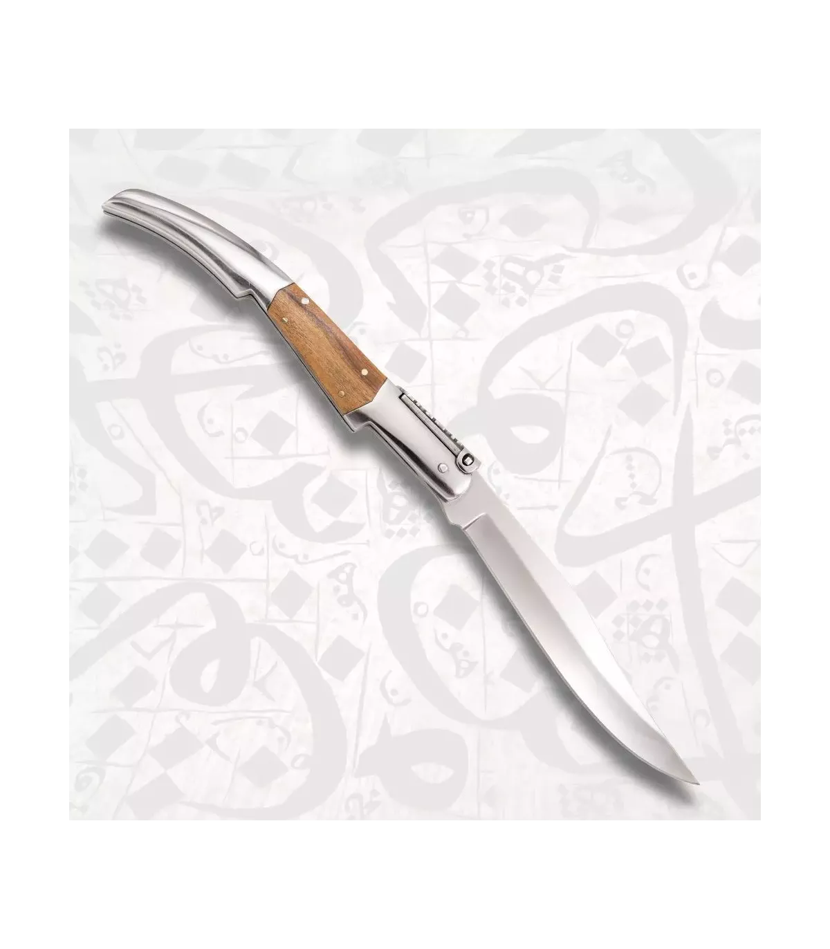 Het handvat, 15,6 cm lang, combineert roestvrij staal met olijfhouten inlays, wat zorgt voor een perfecte balans tussen weerstand, ergonomie en natuurlijke schoonheid. De roestvrijstalen veren en de versierde palen dragen bij aan een verfijnde afwerking van dit stuk, dat bovendien beschikt over een vergrendelingsmechanisme voor extra veiligheid tijdens gebruik. Met een gewicht van slechts 185 gram voelt het licht aan in de hand, waardoor een comfortabele en precieze bediening bij elke snede mogelijk is.