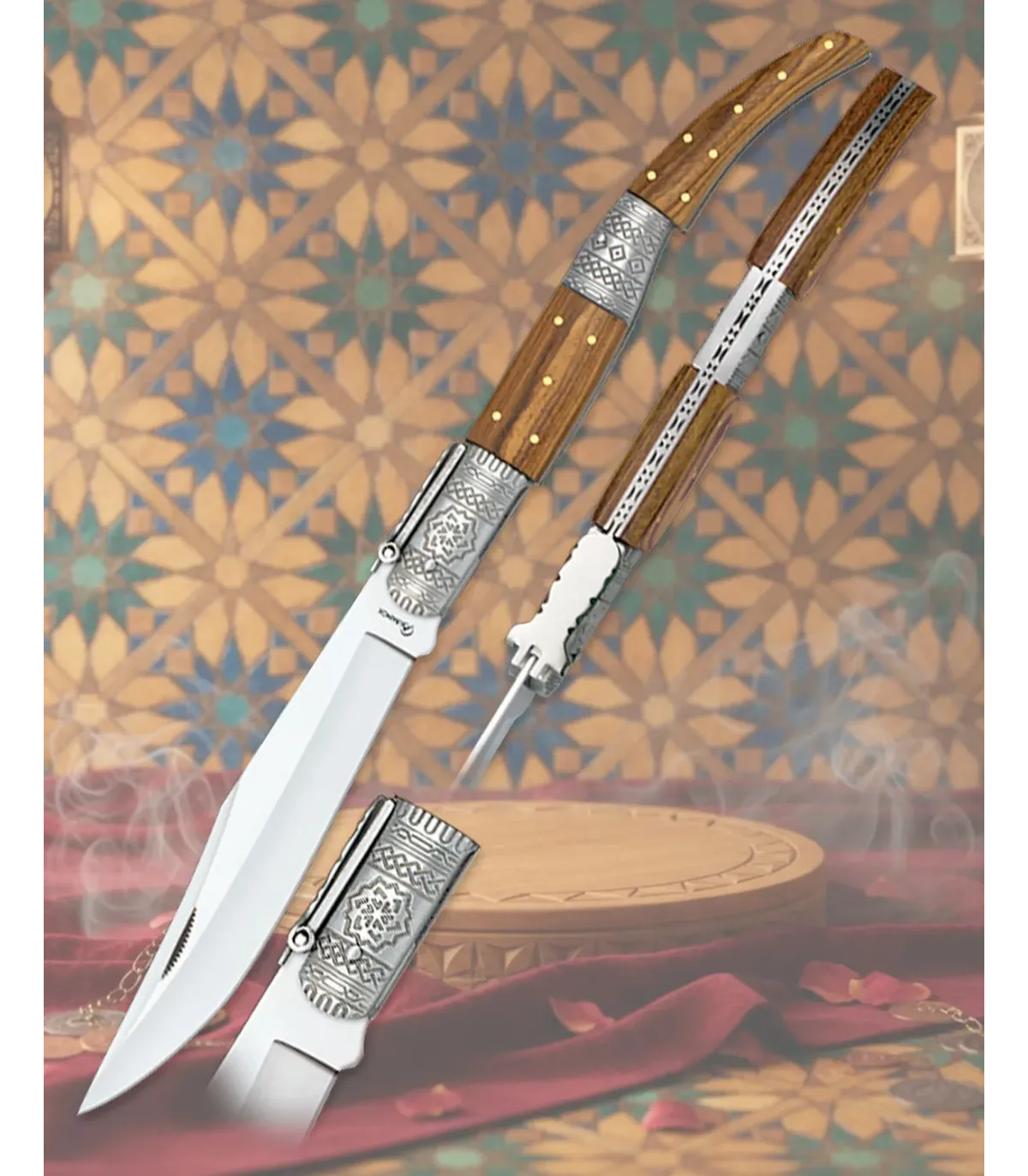 De combinatie van de virola met Arabische decoratie uit de 19e eeuw in reliëf en de handgrepen in zebra hout geeft een exclusieve afwerking die niet onopgemerkt blijft, waardoor dit stuk het middelpunt wordt van elke collectie of een cadeau met karakter. De spiegelafwerking van het lemmet benadrukt niet alleen zijn aanwezigheid, maar maakt ook het schoonmaken gemakkelijker en behoudt die elegante glans na elk gebruik.