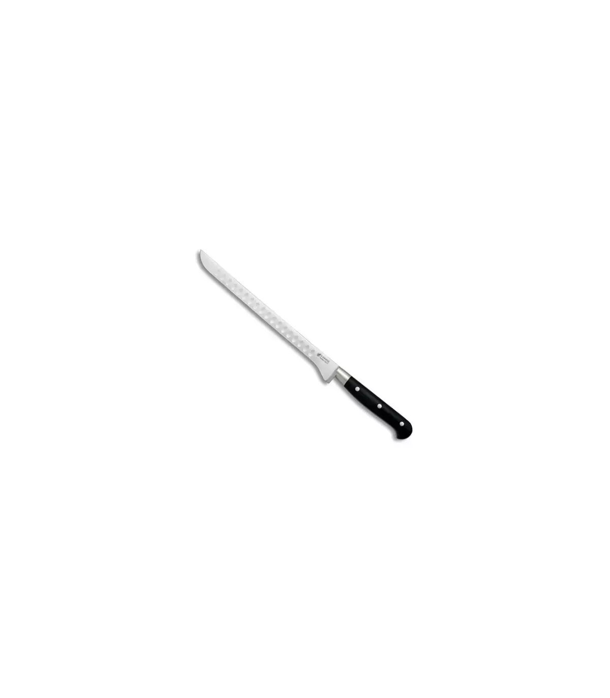 Gemaakt door het gerenommeerde Spaanse merk Albainox, is dit professionele hammes het resultaat van de combinatie van hoogwaardige materialen en uitzonderlijk vakmanschap. De geperforeerde lemmet zorgt voor een betere scheiding van de ham, voorkomt dat het aan het snijvlak blijft plakken en garandeert dat elke plak perfect is.