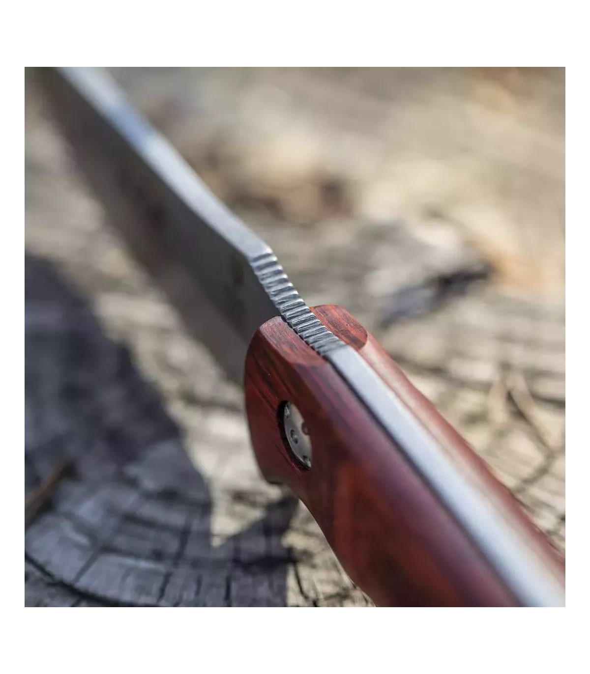 De handgrepen, gemaakt van samengeperst koraalhout en bevestigd met stevige klinknagels, bieden een uitstekende grip in de hand, en combineren comfort en veiligheid bij elk gebruik. Dit wordt aangevuld met een leren schede van topkwaliteit, die niet alleen functioneel is, maar ook een vleugje elegantie toevoegt.