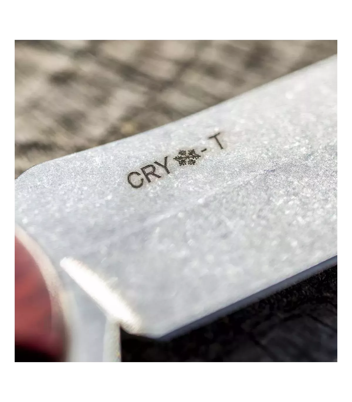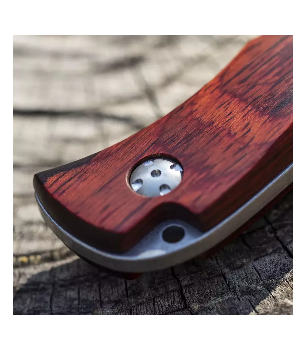 Het lemmet, vervaardigd uit MoVa-staal, heeft een satijnen afwerking die zijn schoonheid en duurzaamheid benadrukt. Het 'drop point'-ontwerp en de tanden aan de bovenkant, bekend als 'jimping', zorgen voor een optimale grip bij taken die precisie vereisen, zoals snijden en schrapen.
