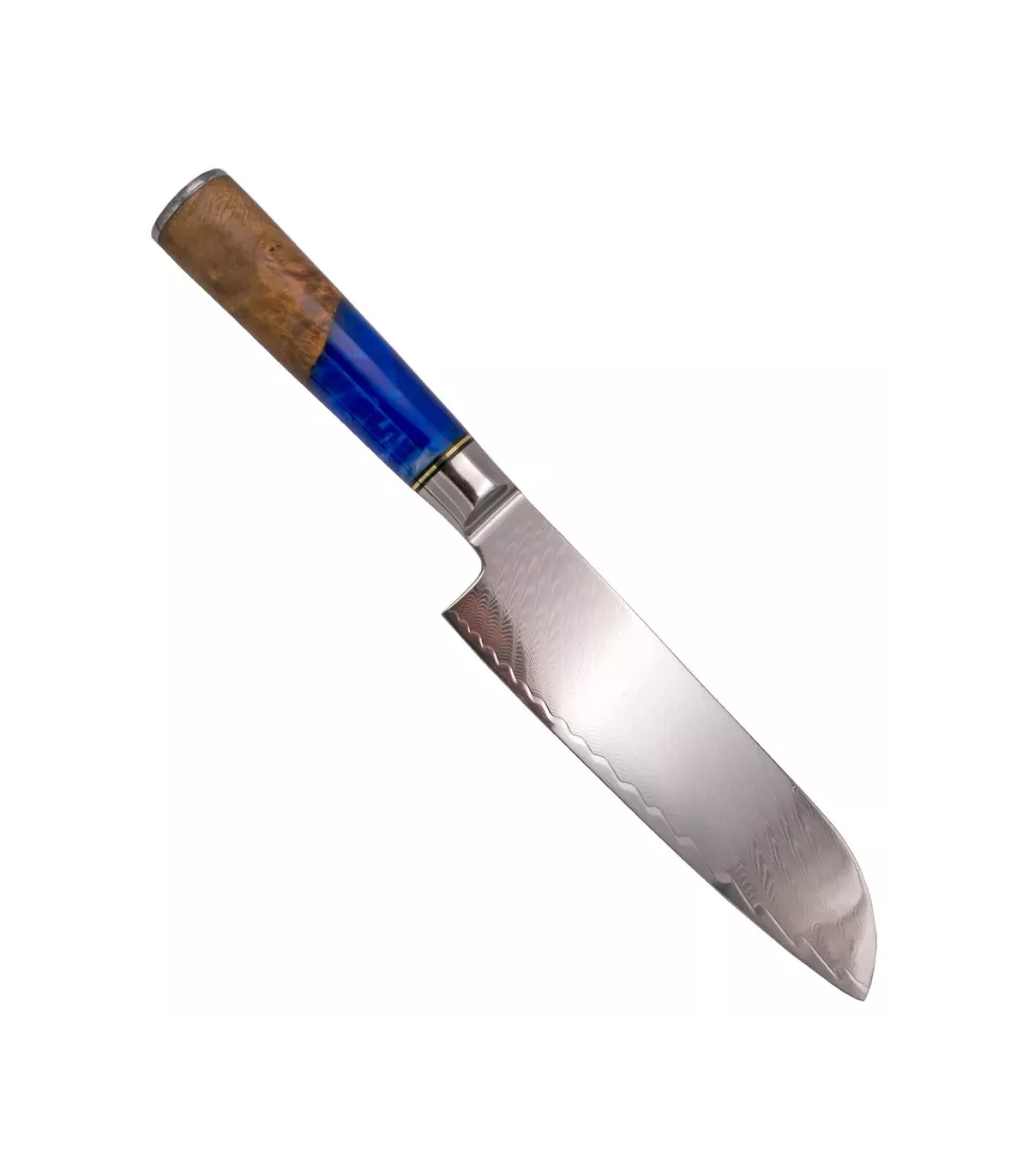 Het handvat van het mes, vervaardigd uit gestabiliseerd hout met elegante bruin- en blauwtinten, is ontworpen voor een comfortabele en ergonomische grip, wat een nauwkeurige controle tijdens het gebruik mogelijk maakt. De epoxy-afwerking benadrukt niet alleen de schoonheid van het handvat, maar beschermt het ook tegen vocht en dagelijks gebruik, waardoor het mes zijn uiterlijk en functionaliteit behoudt over de tijd.