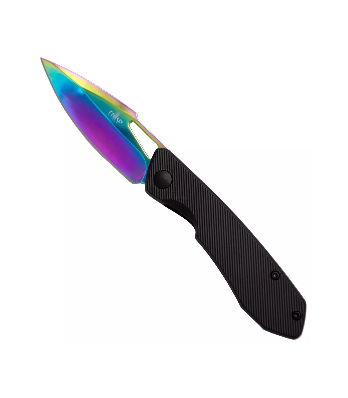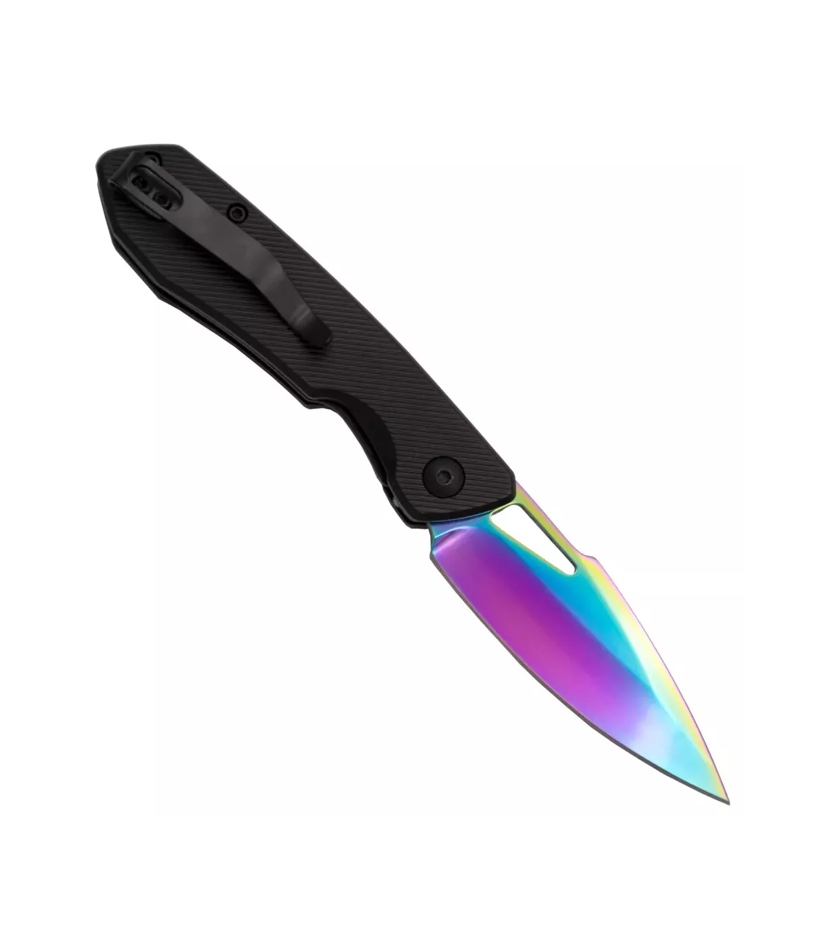 De zwarte aluminium handgreep met textuur biedt een veilige en comfortabele grip, waardoor je hem nauwkeurig kunt hanteren in elke situatie. Het sobere ontwerp contrasteert spectaculair met het 7 cm lange blad, afgewerkt met glanzend rainbow titanium. Deze afwerking zorgt niet alleen voor een indrukwekkend visueel effect, maar verbetert ook de duurzaamheid en weerstand van het blad, zodat het lang scherp en functioneel blijft.