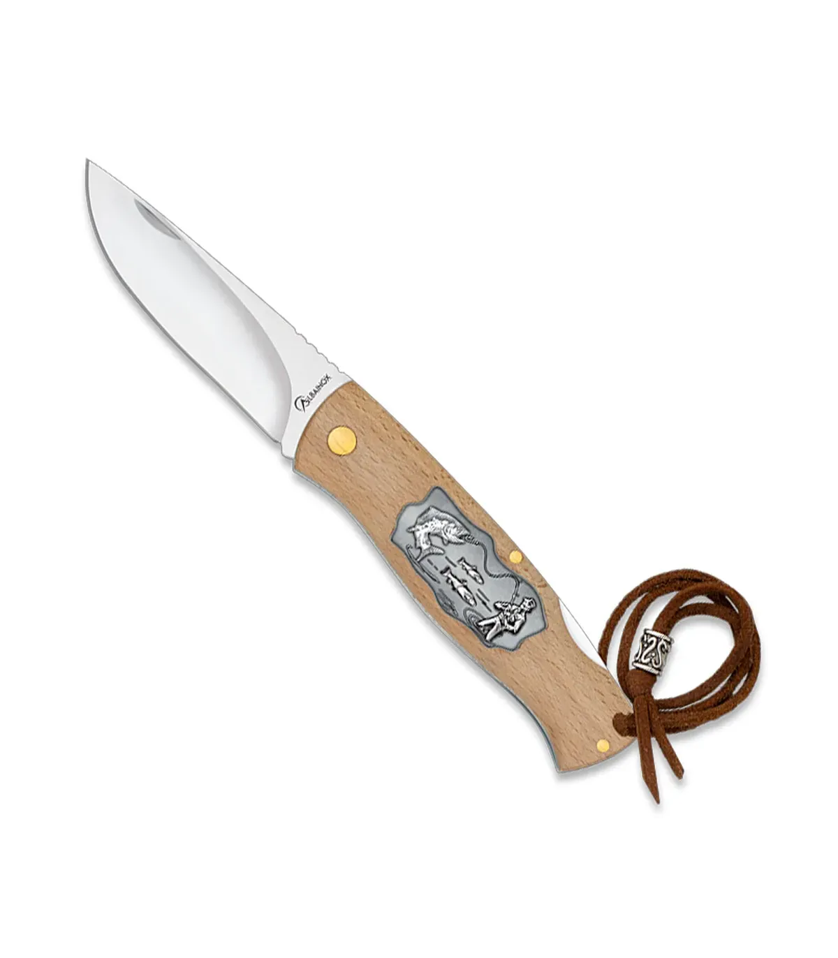 Het handvat van natuurlijk hout biedt een comfortabele en veilige grip, en voegt een rustieke en authentieke uitstraling toe. De gegraveerde decoratieve plaat die een visscène afbeeldt, met een vis en een visser met hengel, versterkt het gespecialiseerde thema, perfect voor liefhebbers van vissen en avontuur.
