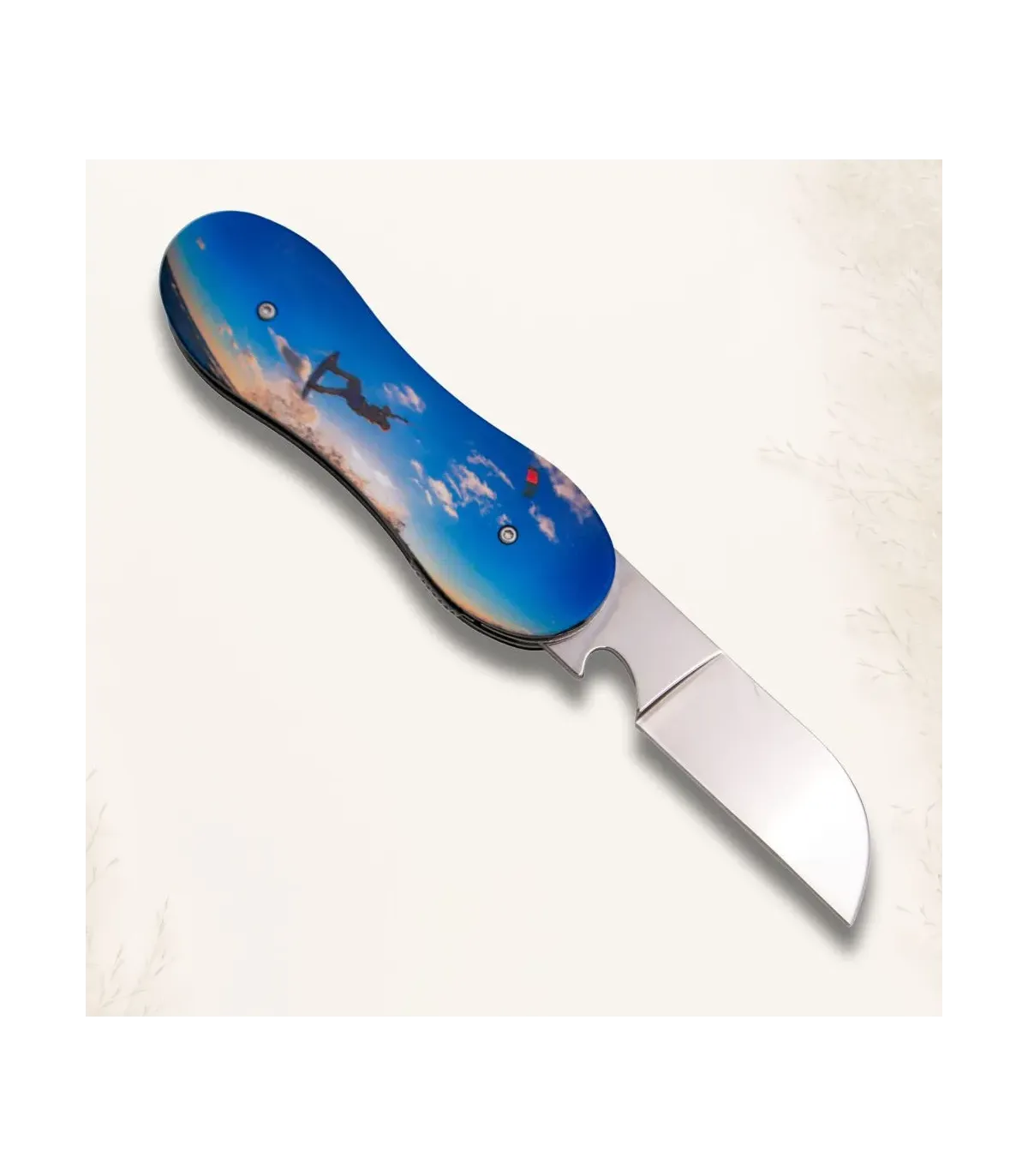 Met een aluminium handvat dat duurzaamheid en lichtheid combineert, past dit zakmes perfect bij jouw behoeften. Het ontwerp met dubbele zijden 3D-prints toont een levendige afbeelding van een kitesurfer in actie, die de opwinding van de zee en de golven oproept. Elke keer dat je het gebruikt, herinner je jezelf aan de vrijheid die je voelt wanneer je over het water glijdt.