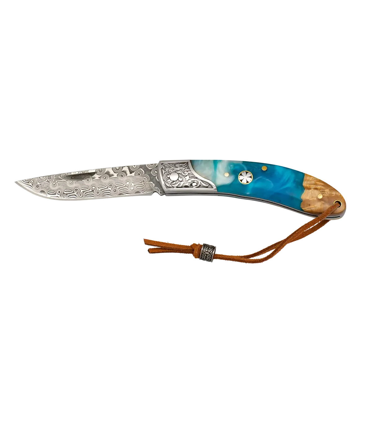 - Dit zakmes heeft een lemmet met 73 lagen damaststaal, waardoor een ingewikkeld en betoverend patroon ontstaat. Elk mes is uniek en weerspiegelt de inherente schoonheid van staal in zijn meest verfijnde vorm.