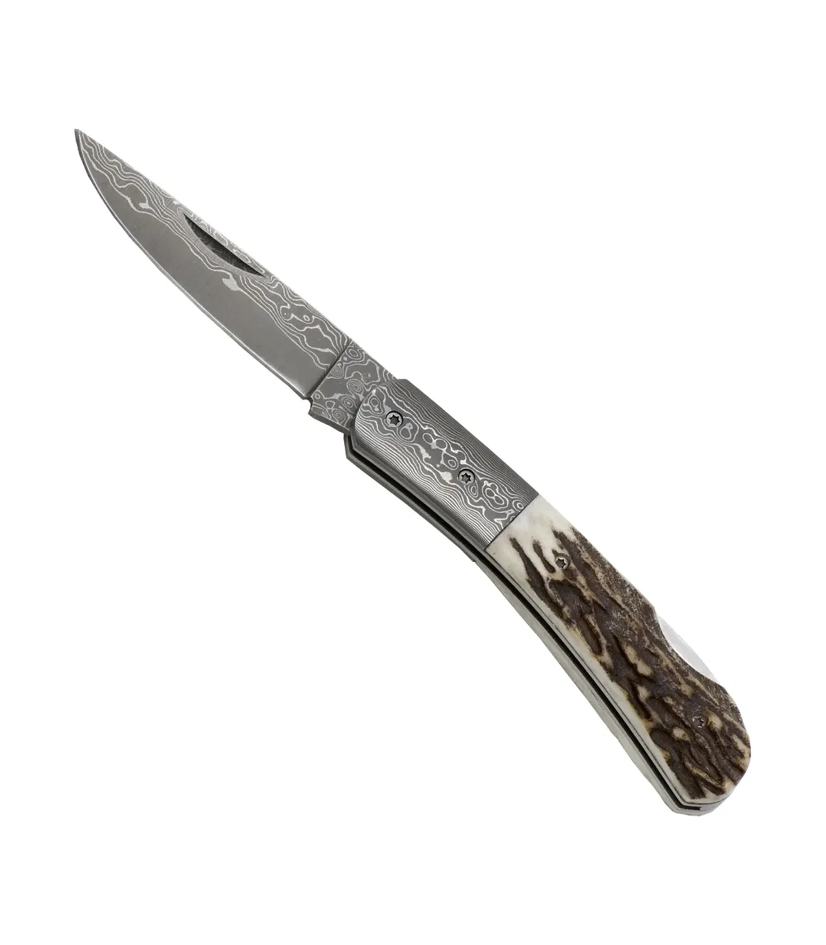 Damaszener mes 71 lagen, gewei-handvat, achtervergrendeling
