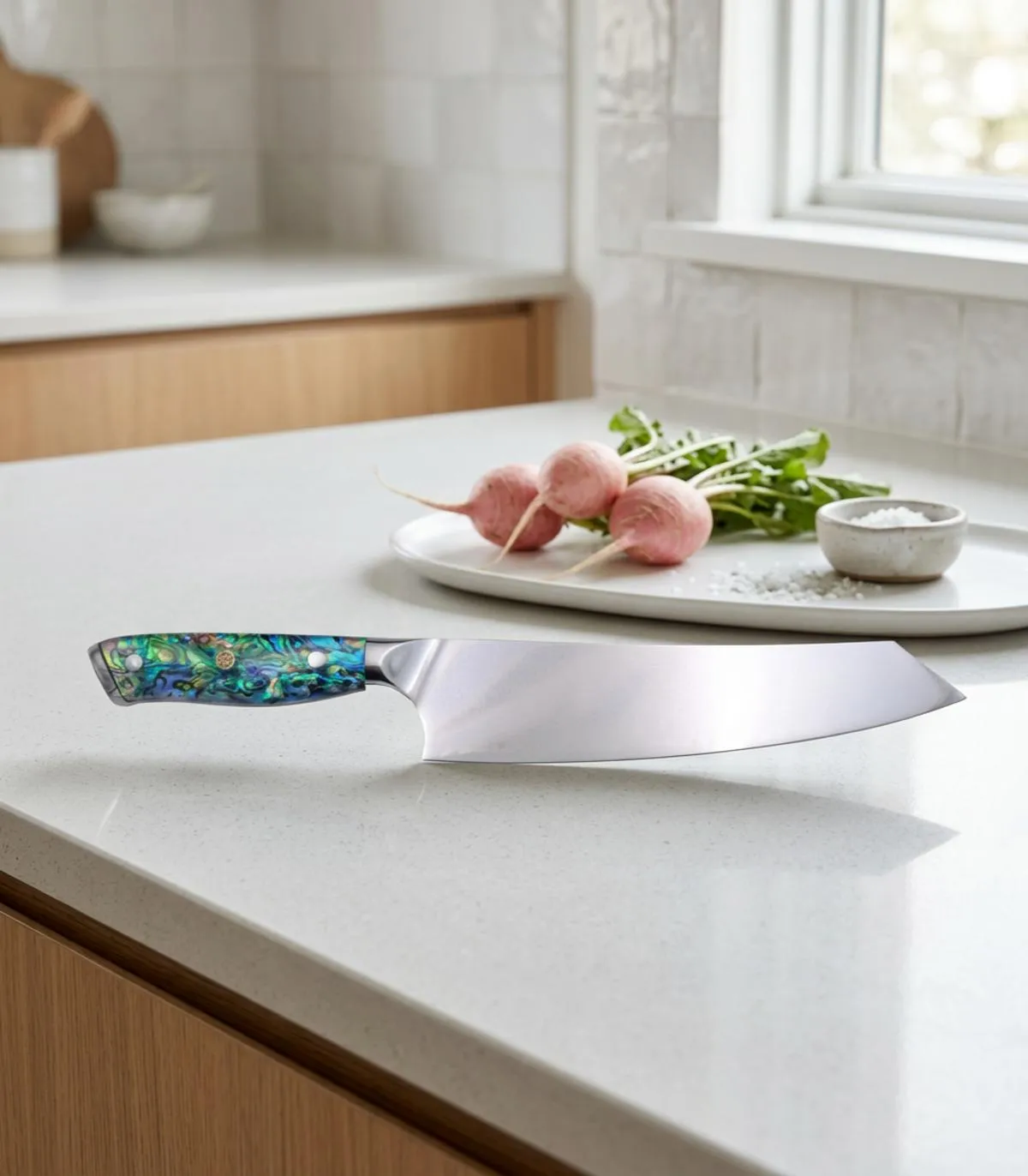 Voelt je dat je keuken meer verdiend dan gewone gereedschappen, dat elke snede die je maakt jouw beheersing, precisie en passie weerspiegelt? Je bent op een punt gekomen waarop je meer wilt dan een eenvoudig hulpmiddel; je zoekt een bondgenoot die je vaardigheden naar een hoger niveau tilt, die je echt competent en zelfverzekerd laat voelen bij elke bereiding. Hier onthult zich het geheim: datgene wat elke beweging transformeert in een expressie van kunst, in een daad van absolute controle, heet Tramuntana Knives Kiritsuke Damast. Dit stuk is niet alleen een mes, het is de belichaming van je toewijding aan uitmuntendheid, een uitbreiding van je essentie die spreekt van jouw discipline en verfijning.