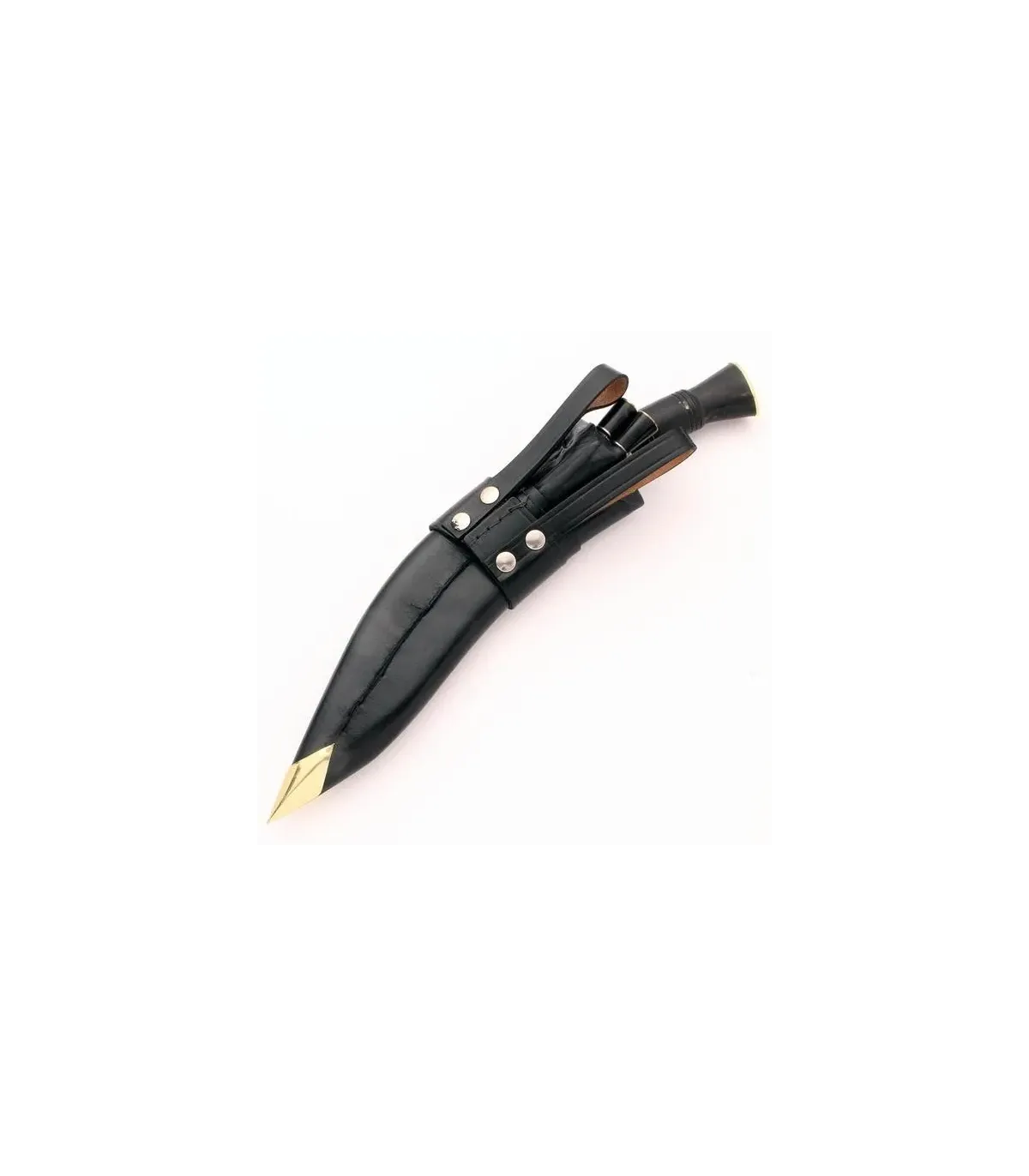 Dit Kukri bevat niet alleen het indrukwekkende hoofdmes, maar wordt ook geleverd met een houten en leren schede, ontworpen om het mes te beschermen en de levensduur te verlengen. Daarnaast vind je in deze schede twee kleine messen: de 'chakmak' en de 'karda'. De chakmak, gebruikt om het hoofdmes te slijpen, en de karda, een klein multifunctioneel mes, bieden extra gereedschappen voor diverse taken.