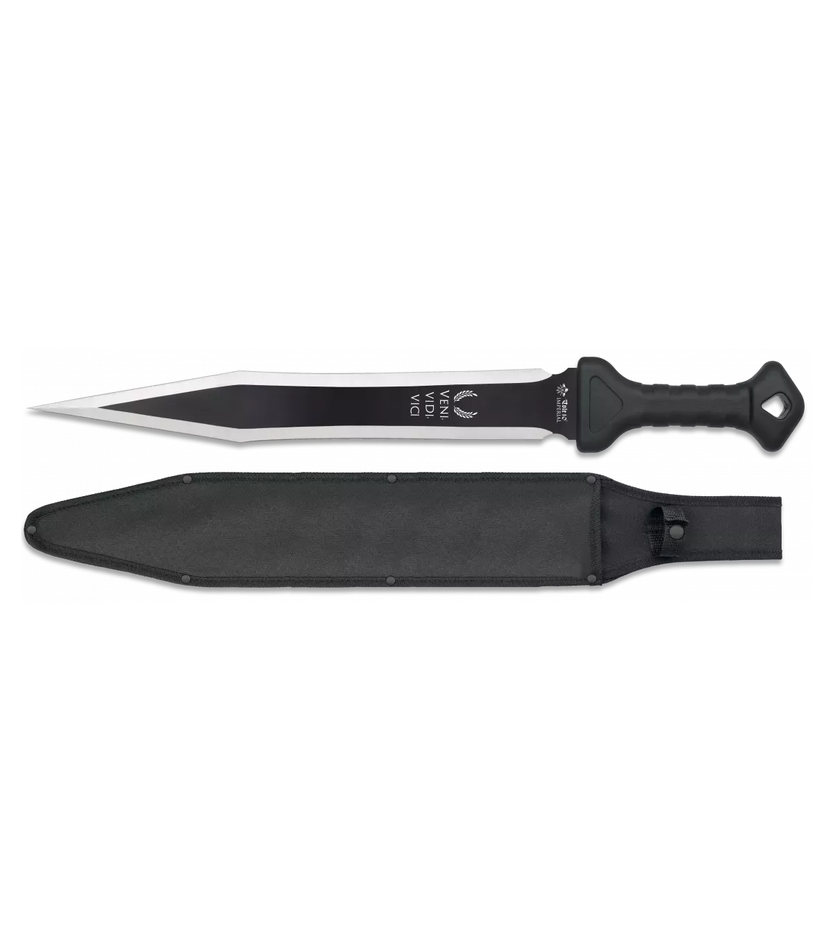 Machete met dubbele snijkant Coliseo met lemmet van 3CR13MOV staal, gegraveerd met de inscriptie 'Veni, Vidi, Vici' en een lauriervruchttekening. Het handvat is gemaakt van zwart ABS. Inclusief zwarte nylon schede, klaar om aan de riem te hangen.