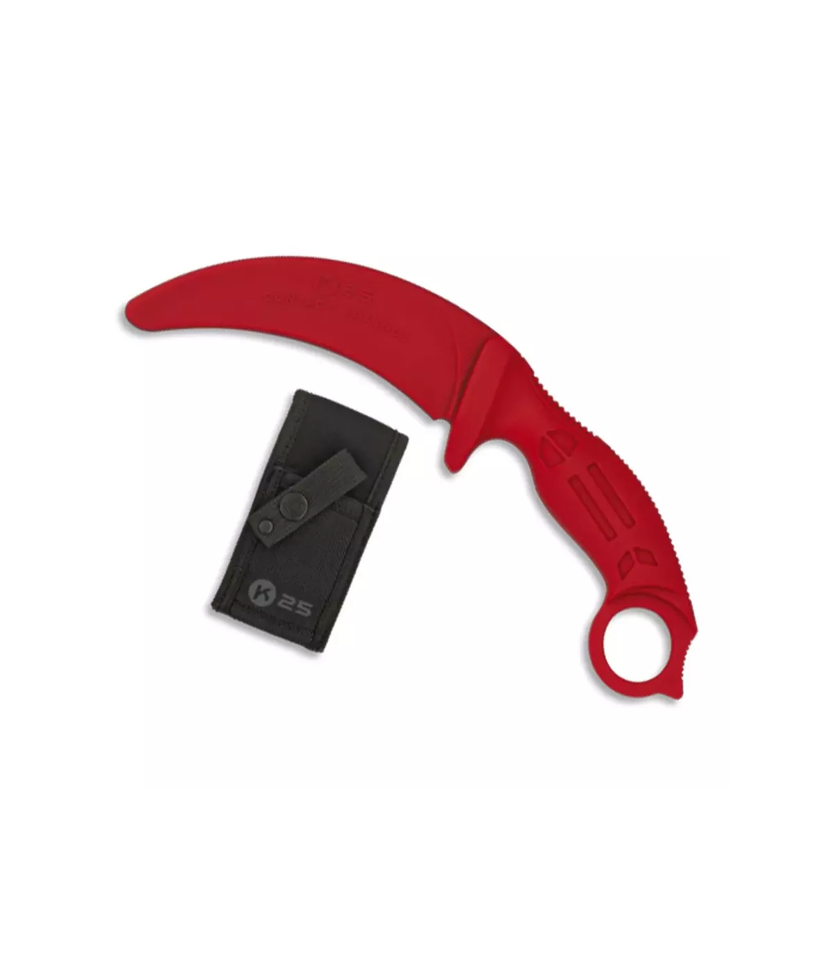 Aarzel niet langer en verkrijg vandaag nog de trainingsmes met gebogen lemmet en rode kleur K25. Voeg dit gereedschap toe aan uw trainingsarsenaal en word een expert in het hanteren van messen!